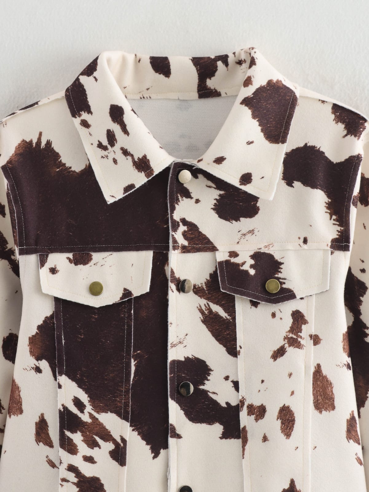 Trendy jacket featuring a bold cow-print pattern, structured silhouette, and button-front closure—perfect for adding a playful edge to casual looks.