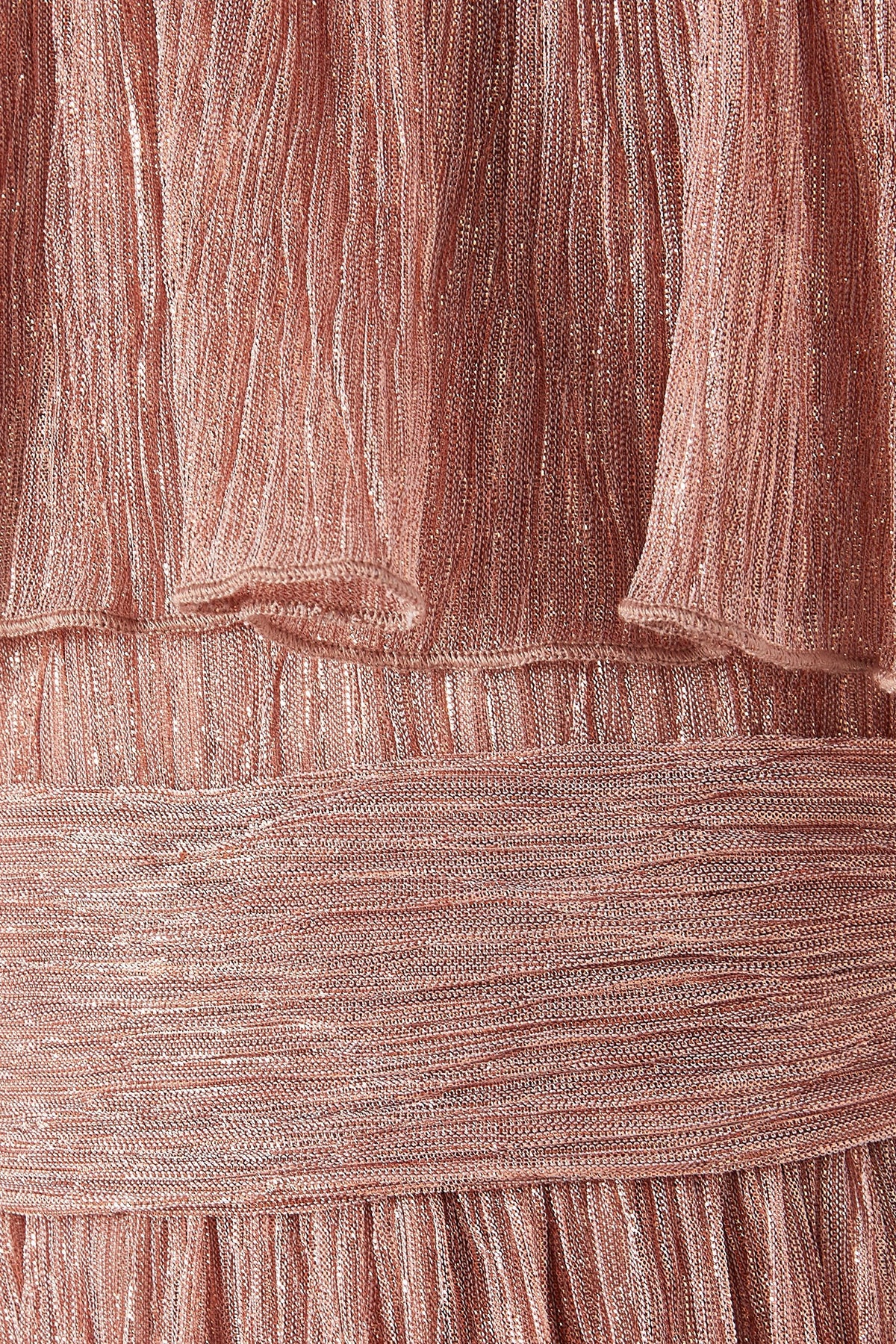An elegant maxi dress crafted from softly shimmering pleated fabric in a warm rose tone. Designed with a delicate ruffled overlay across the bodice, a cinched waist for a flattering silhouette, and a floral accent at the shoulder for a refined statement. Flowing gracefully with every step, this dress is perfect for evening events, formal occasions, and sophisticated celebrations.