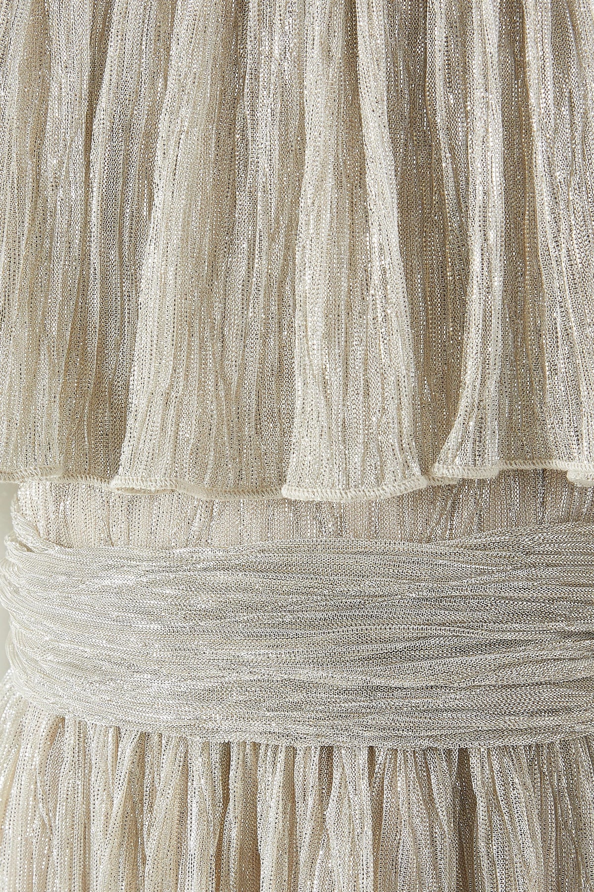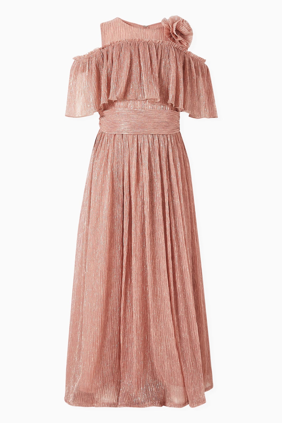 Shimmer Pleated Maxi Dress with Ruffled Overlay & Floral Accent – GLINT