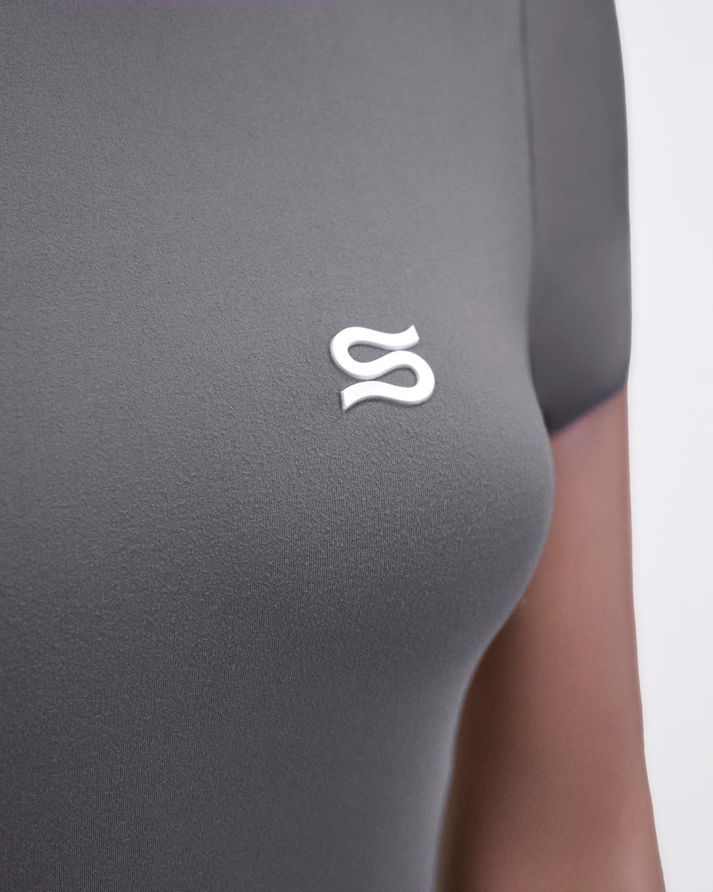 Modern slate grey jumpsuit featuring a fitted short-sleeve top, scoop neckline, and slim leg with a flared hem. Crafted in soft stretch fabric for a sculpted yet comfortable silhouette—ideal for sleek athleisure, studio workouts, or casual everyday styling.