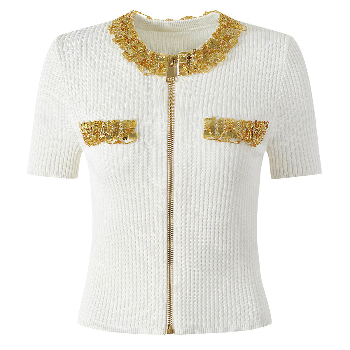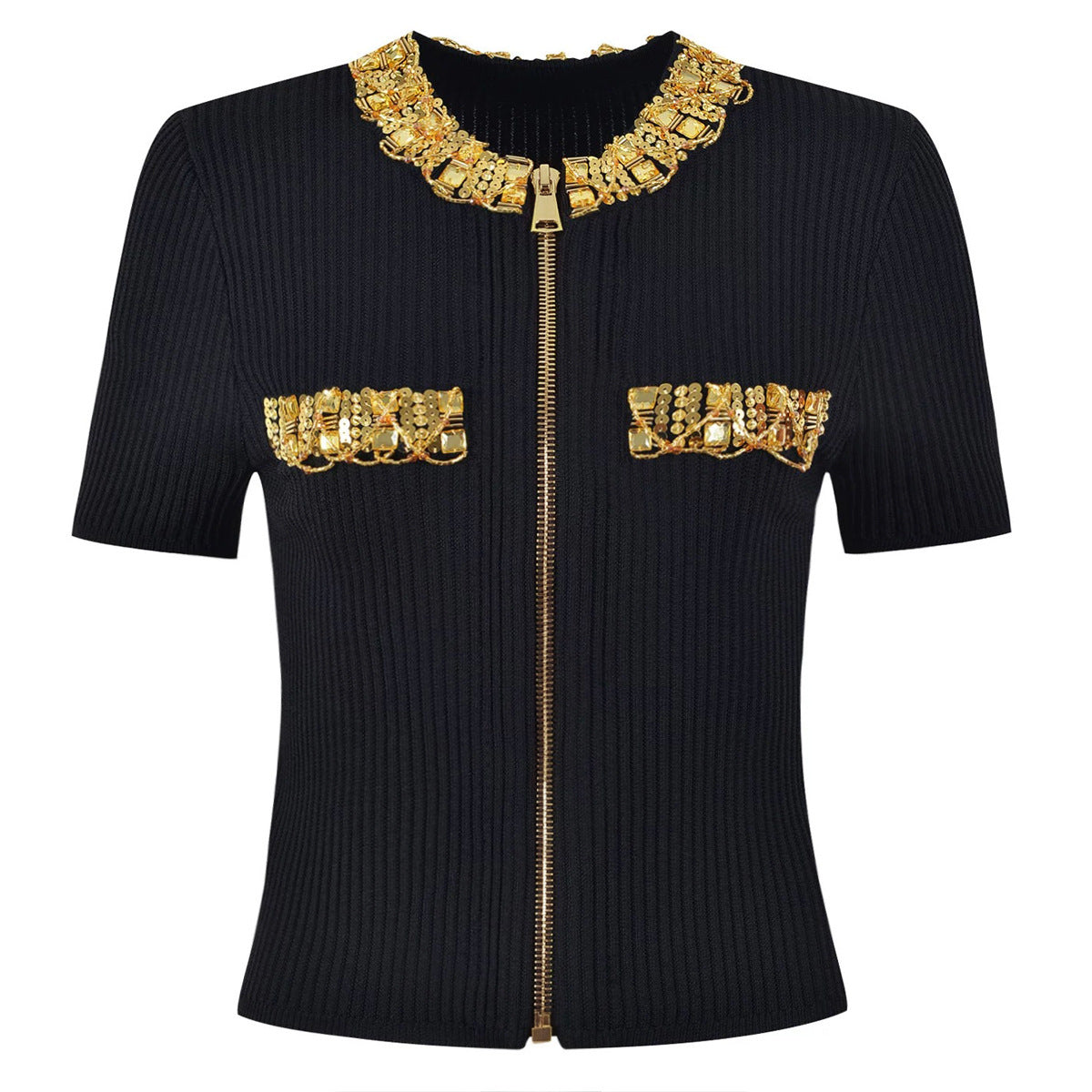 A chic ribbed knit blouse featuring a front zip closure and gold embellishments at the neckline and pockets for a touch of sophisticated elegance. Fabric name: viscose fiber Size Bust (cm) Waist (cm) Shoulder (cm) Length (cm) Sleeve (cm) 2Xs 82 74 36 52 22 Xs 86 78 37 53 23 S 90 82 38 54 24