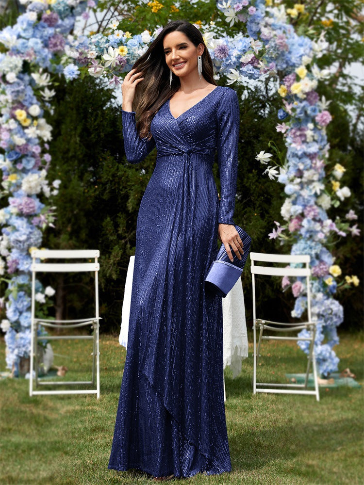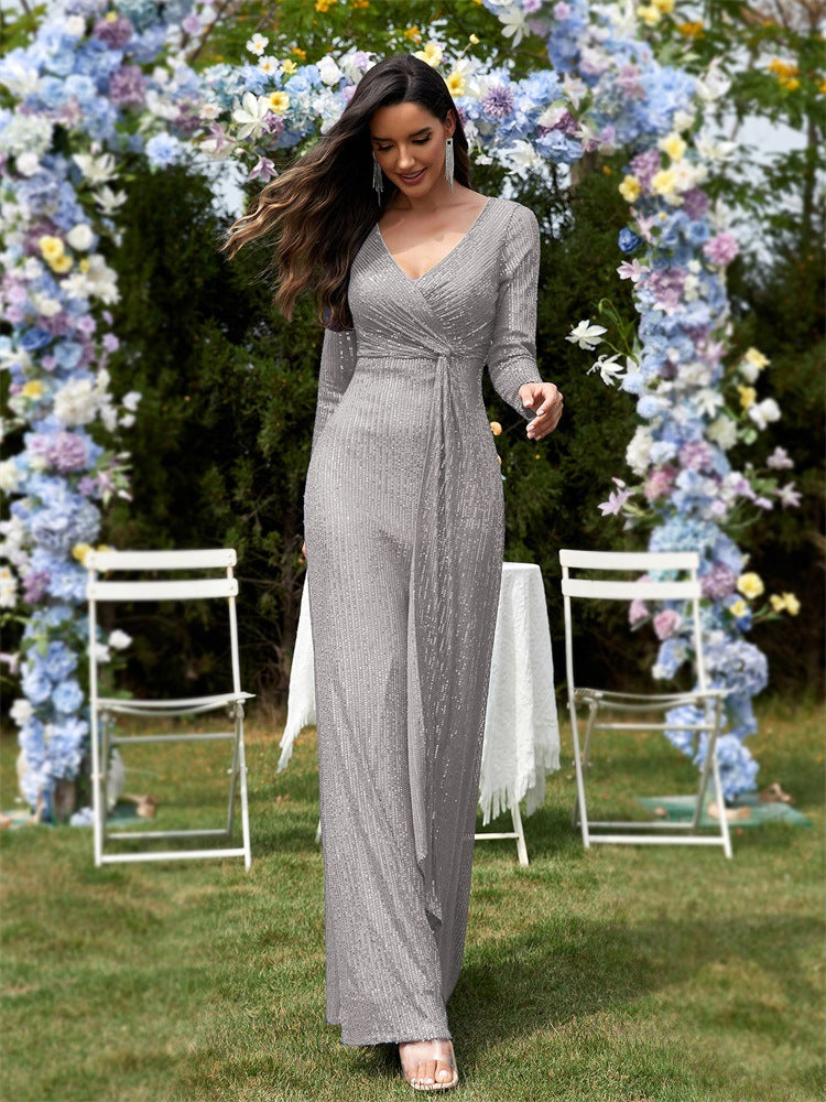 Radiant fuchsia gown adorned with shimmering sequins, featuring a V-neckline, elegant wrap design, and floor-length silhouette—perfect for evening glamour or special celebrations.