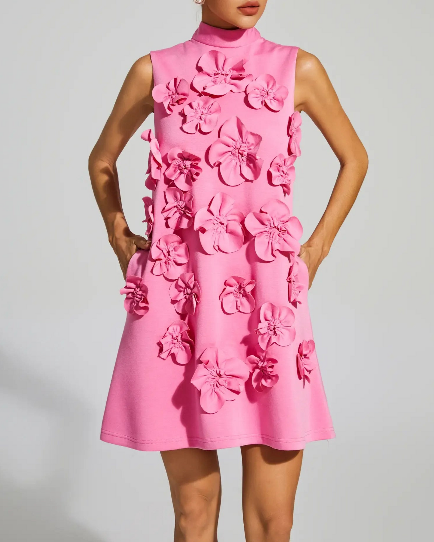 Elegant sleeveless mini dress with 3D floral appliqués, a chic high neckline, and an A-line silhouette. Perfect with playful and sophisticated charm.