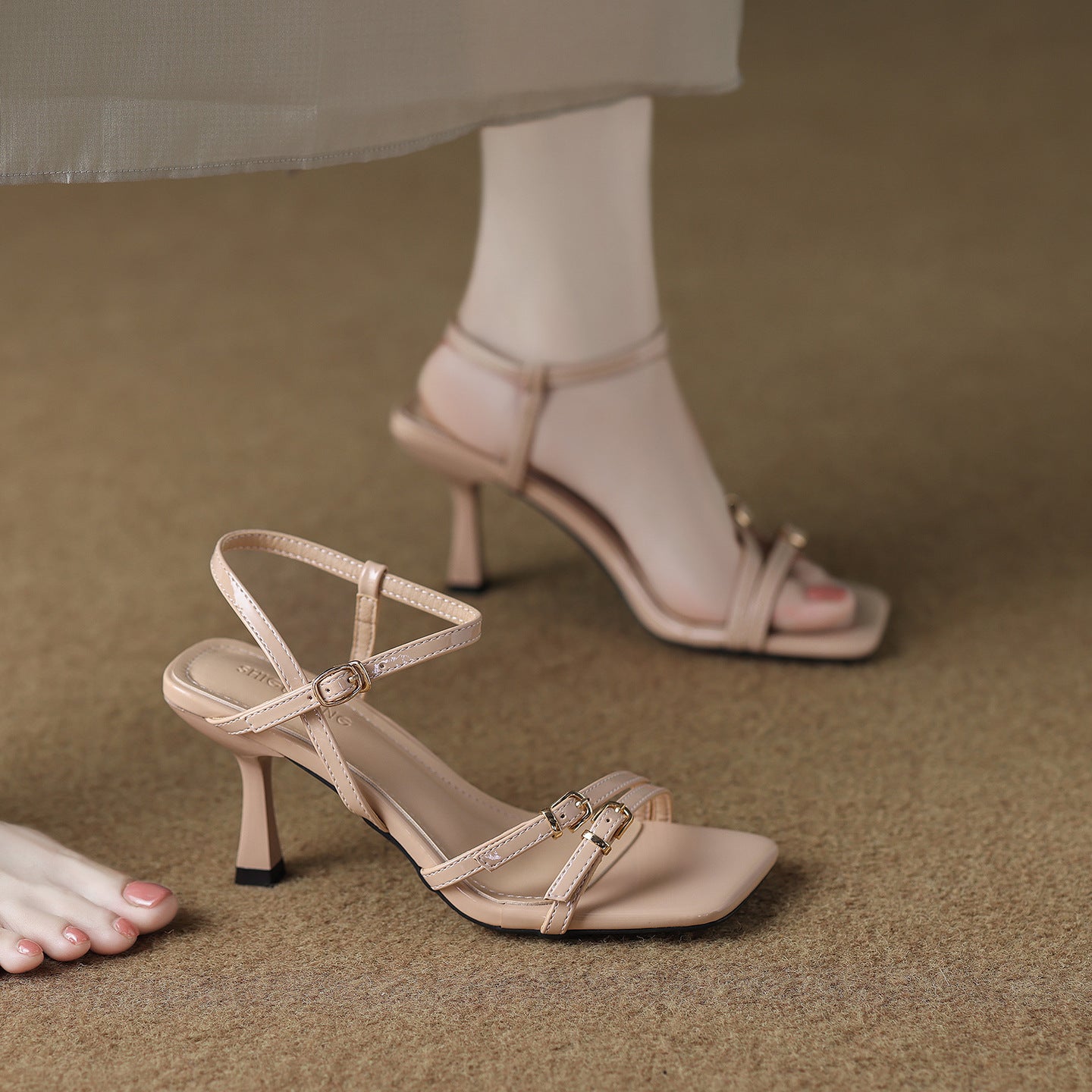 Elegant strappy sandals with a modern square toe, slim adjustable buckles, and a sleek mid-heel. Designed for versatile styling, they bring effortless chic to your looks.