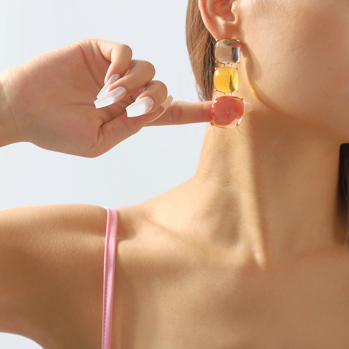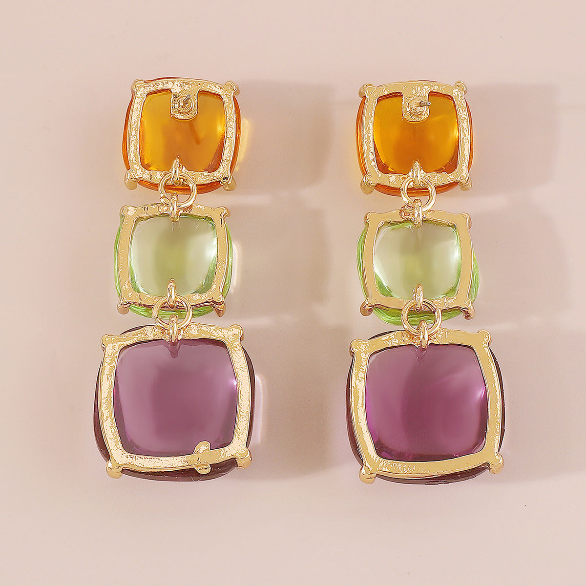 Modern drop earrings featuring three stacked glossy cushion-cut stones in playful contrasting colors.