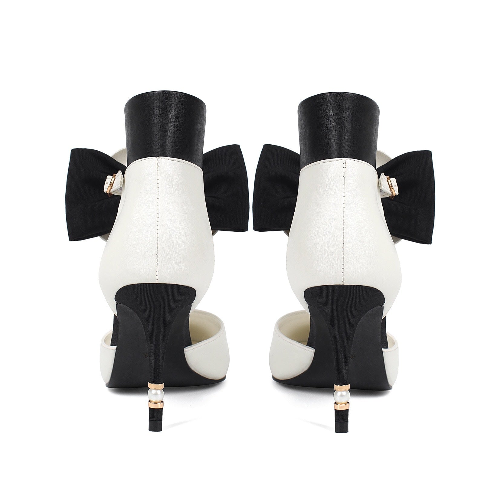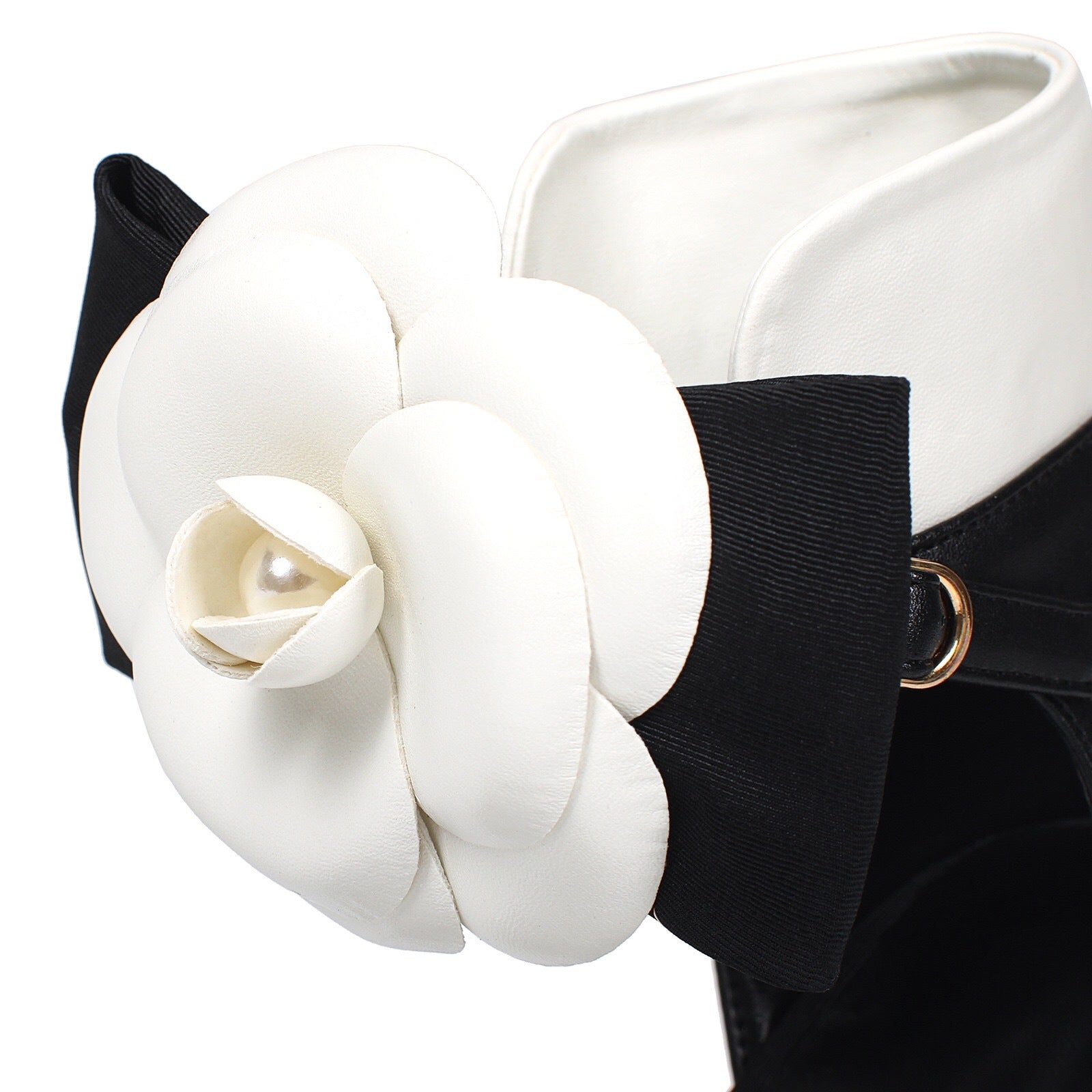 Sophisticated beige and black heels featuring a pointed toe, delicate ankle strap, and oversized camellia flower detail. Finished with a pearl-adorned stiletto heel for a timeless feminine touch.
