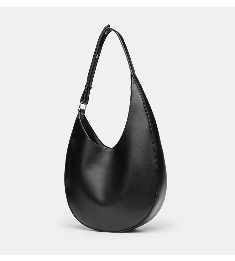 A modern crescent-shaped shoulder bag crafted from smooth, supple leather with a clean sculptural silhouette. Designed with a slim adjustable strap and minimalist finish, this elegant piece is perfect for effortless everyday styling—from casual daytime looks to refined evening outfits.