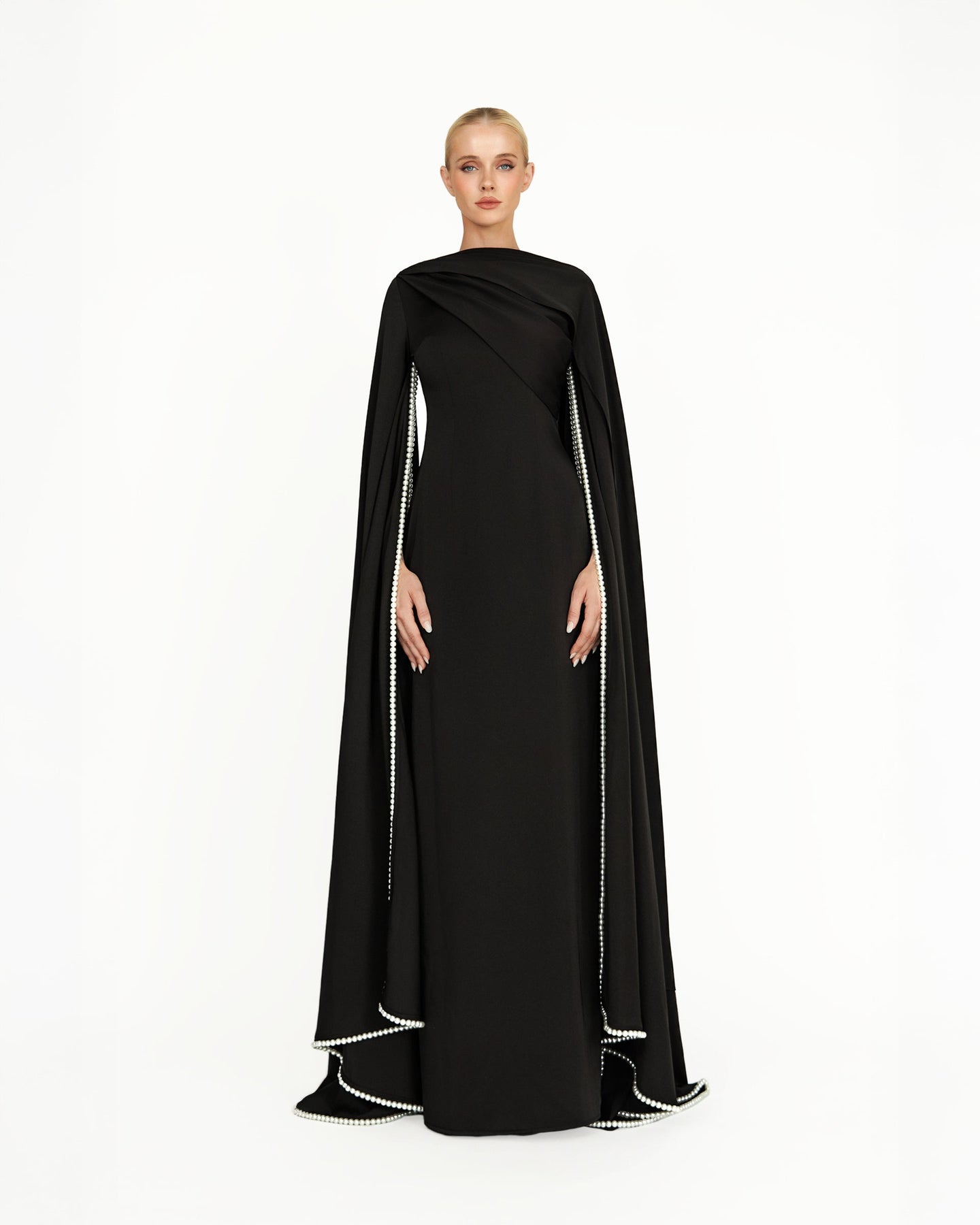 cape-sleeve column gown with pearl trim – NOIRELLE