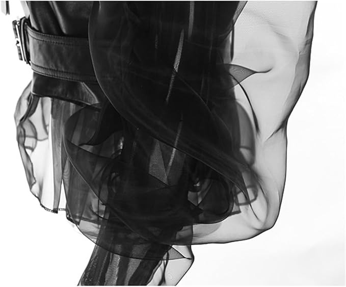 Statement biker-style jacket crafted from sleek leather with sheer organza puff sleeves and a belted waist. A bold fusion of edgy and romantic elegance. Fabric name: pu Size Length (cm) Shoulder (cm) Bust (cm) Sleeve Length (cm) Xs 55 35 86 57 S 56 36 90 58 M 57 37 94 59 L 58 38 98 60 Xl 59 39 102 61
