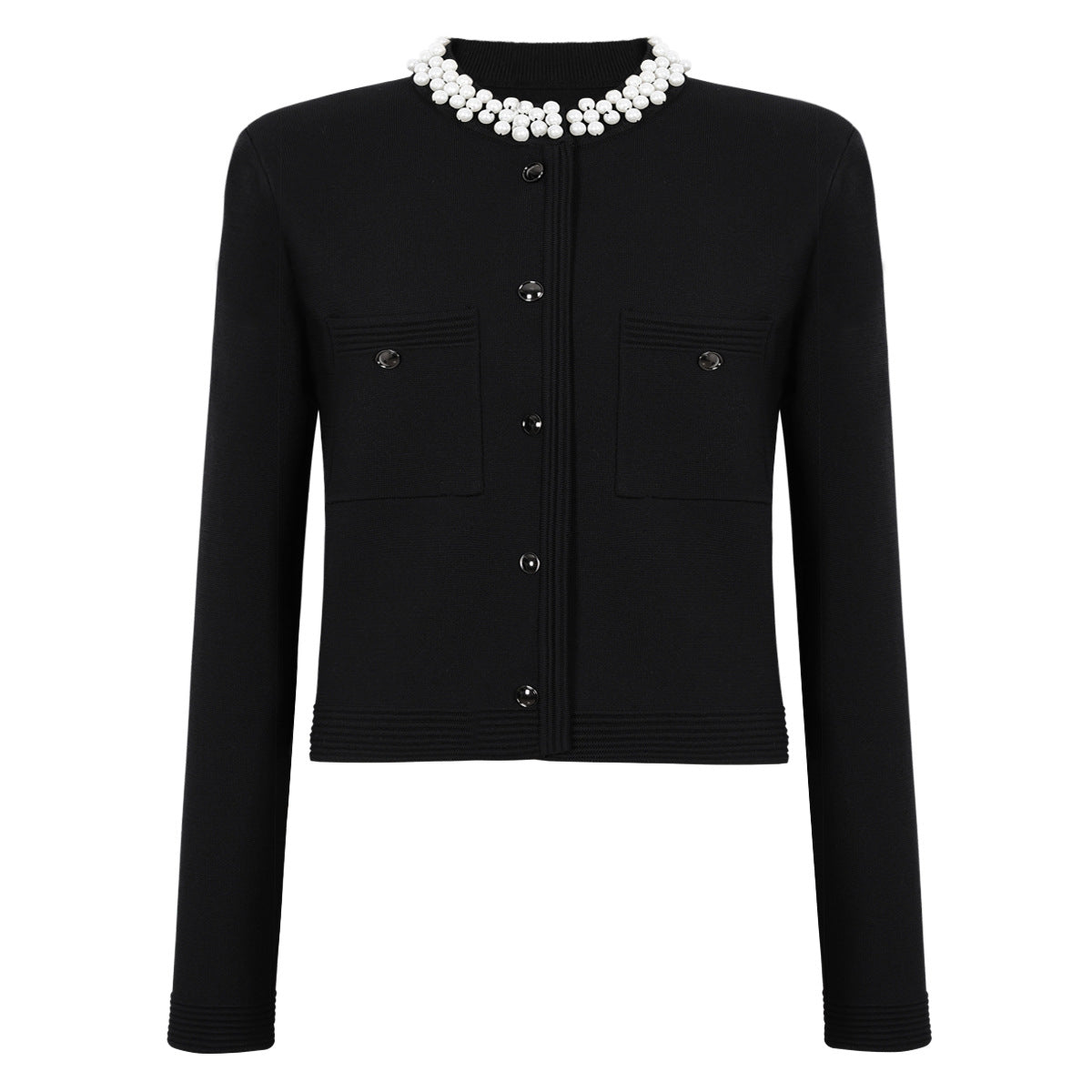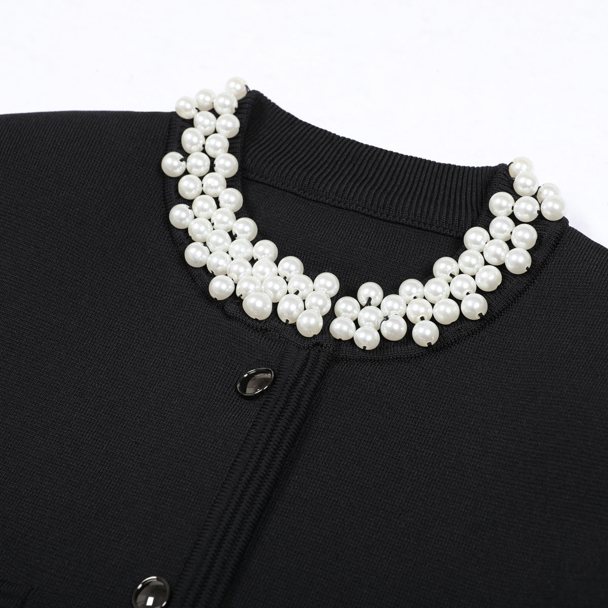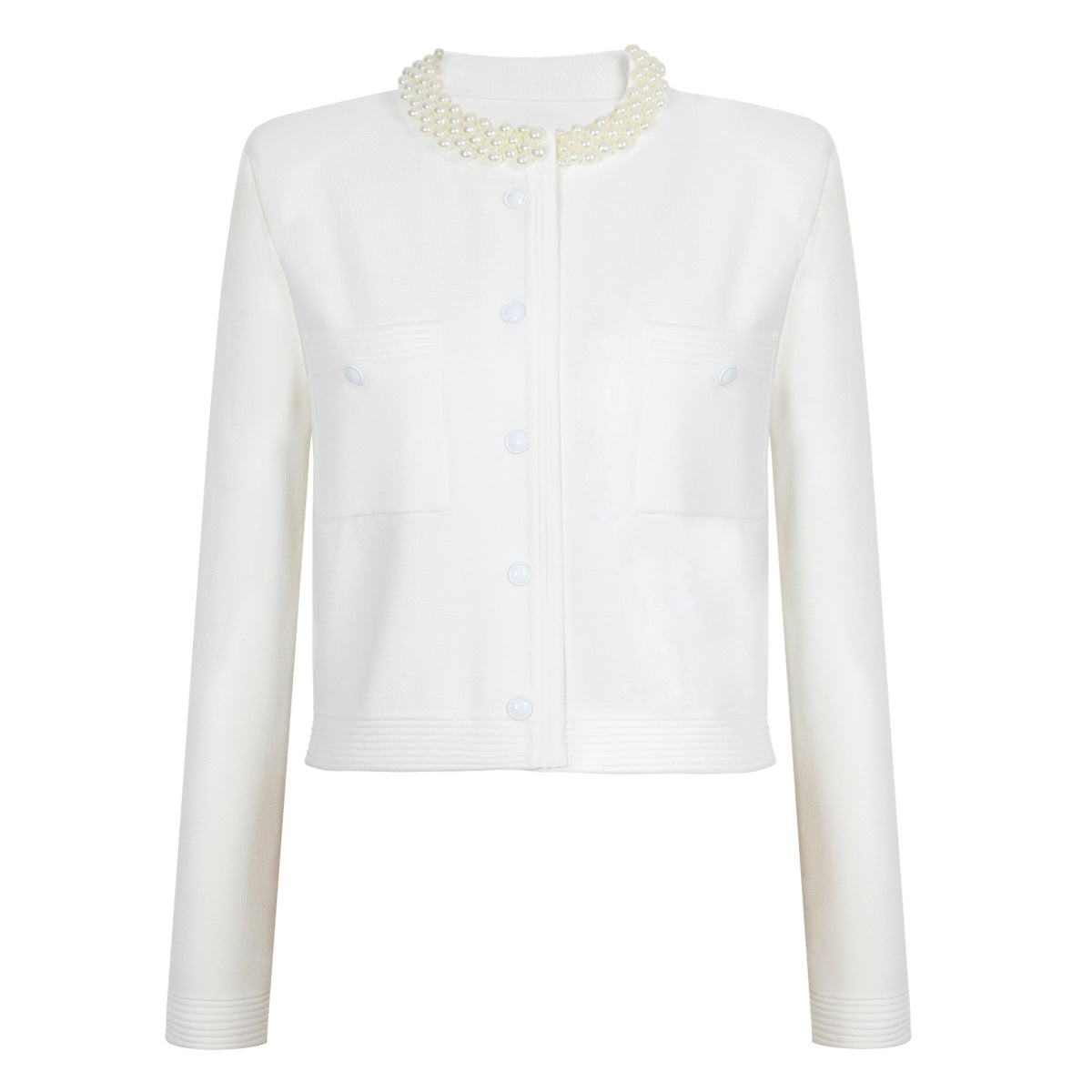A chic cropped cardigan-style jacket featuring a pearl-embellished collar, front pockets, and a button-down design. Perfect for elevating both casual and elegant looks with timeless sophistication. Fabric name: viscose fiber Size Bust (cm) Waist (cm) Shoulder (cm) Length (cm) Sleeve (cm) S 92 86 36 52 62 M 96 90 37 53 63 L 100 94 38 54 64