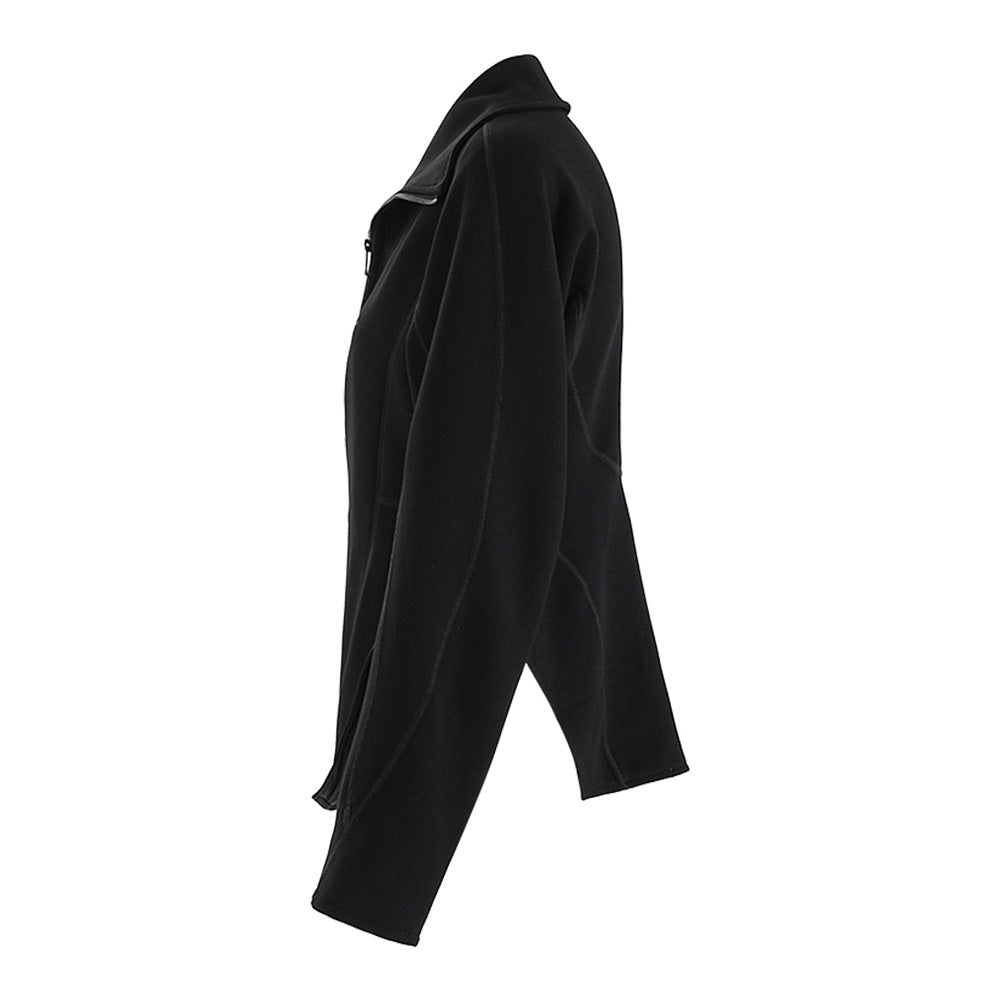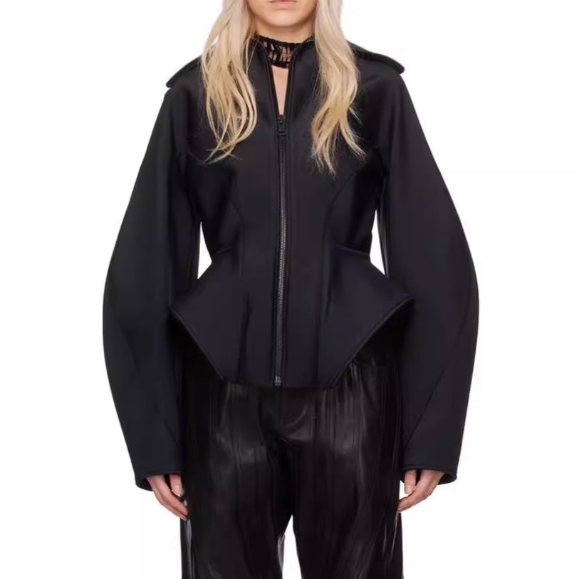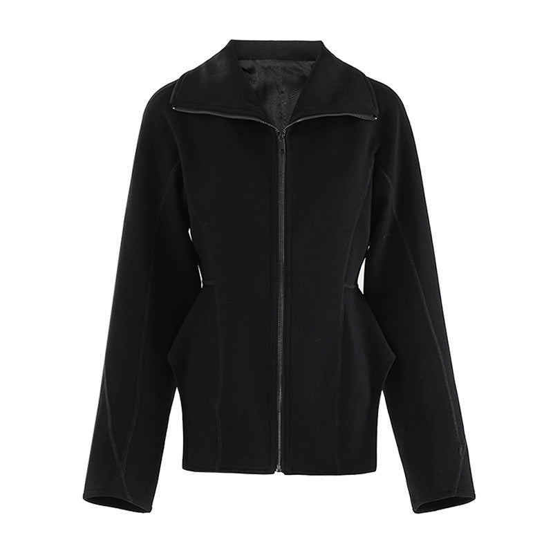 A sleek black jacket with a structured silhouette, featuring a high collar and front zip closure. Perfectly tailored for a modern, minimalist look. Fabric name: polyester Size Length (cm) Bust (cm) Waist (cm) Shoulder + Sleeve (cm) S 64 100 76 71 M 65 104 80 72 L 66 108 84 73