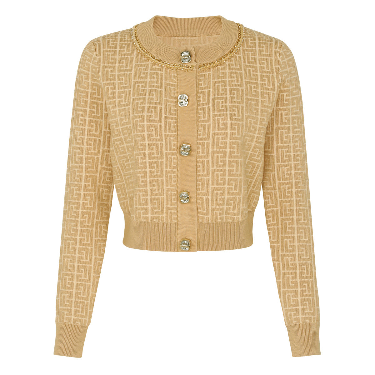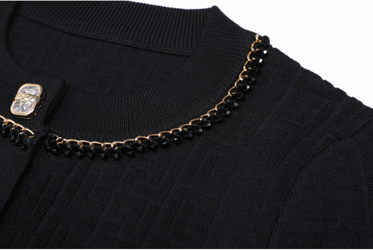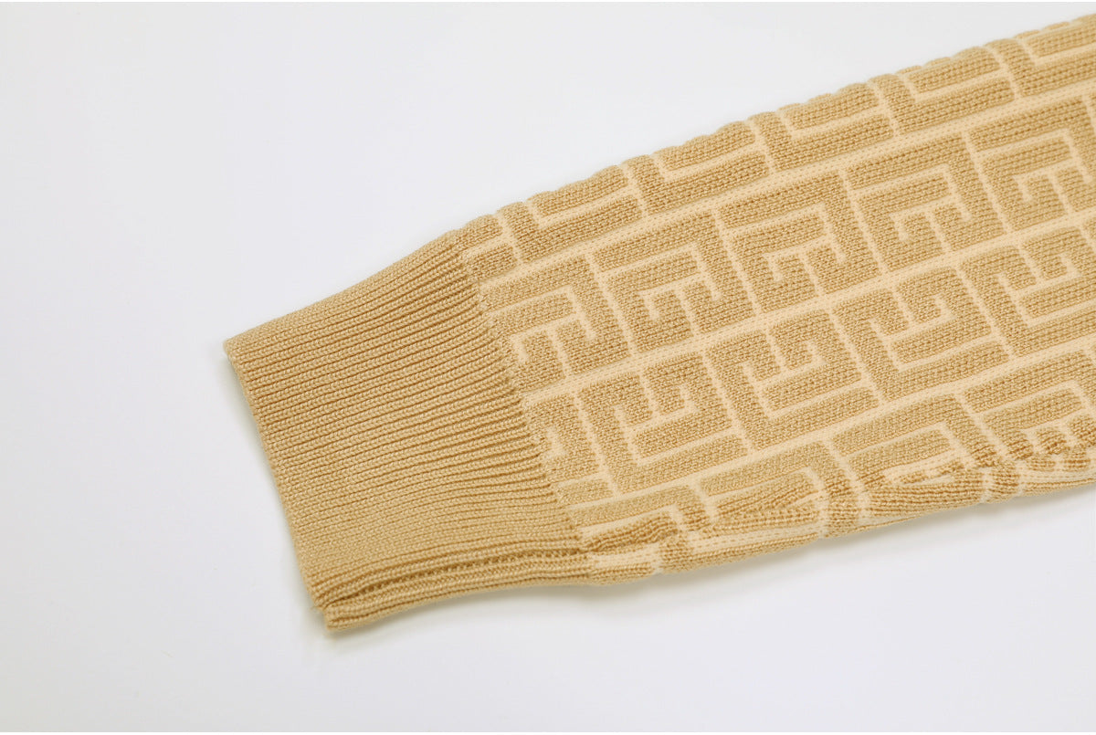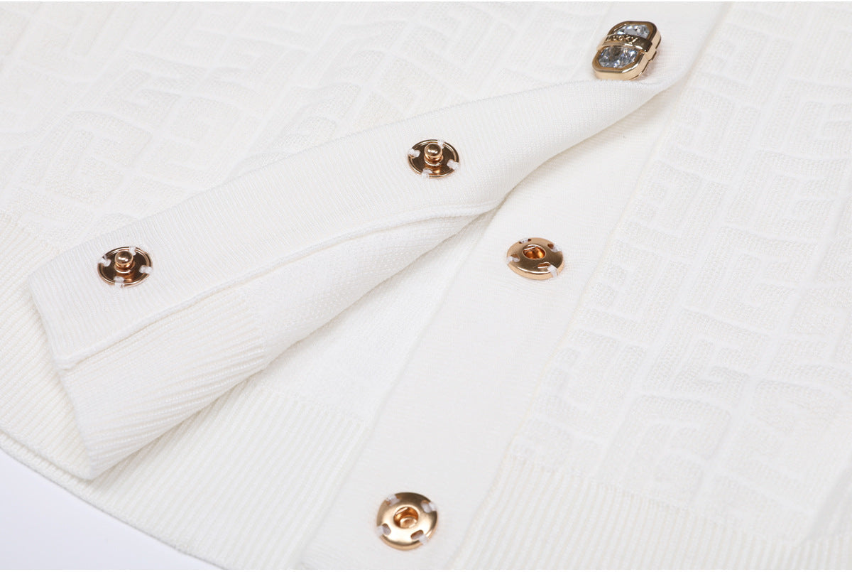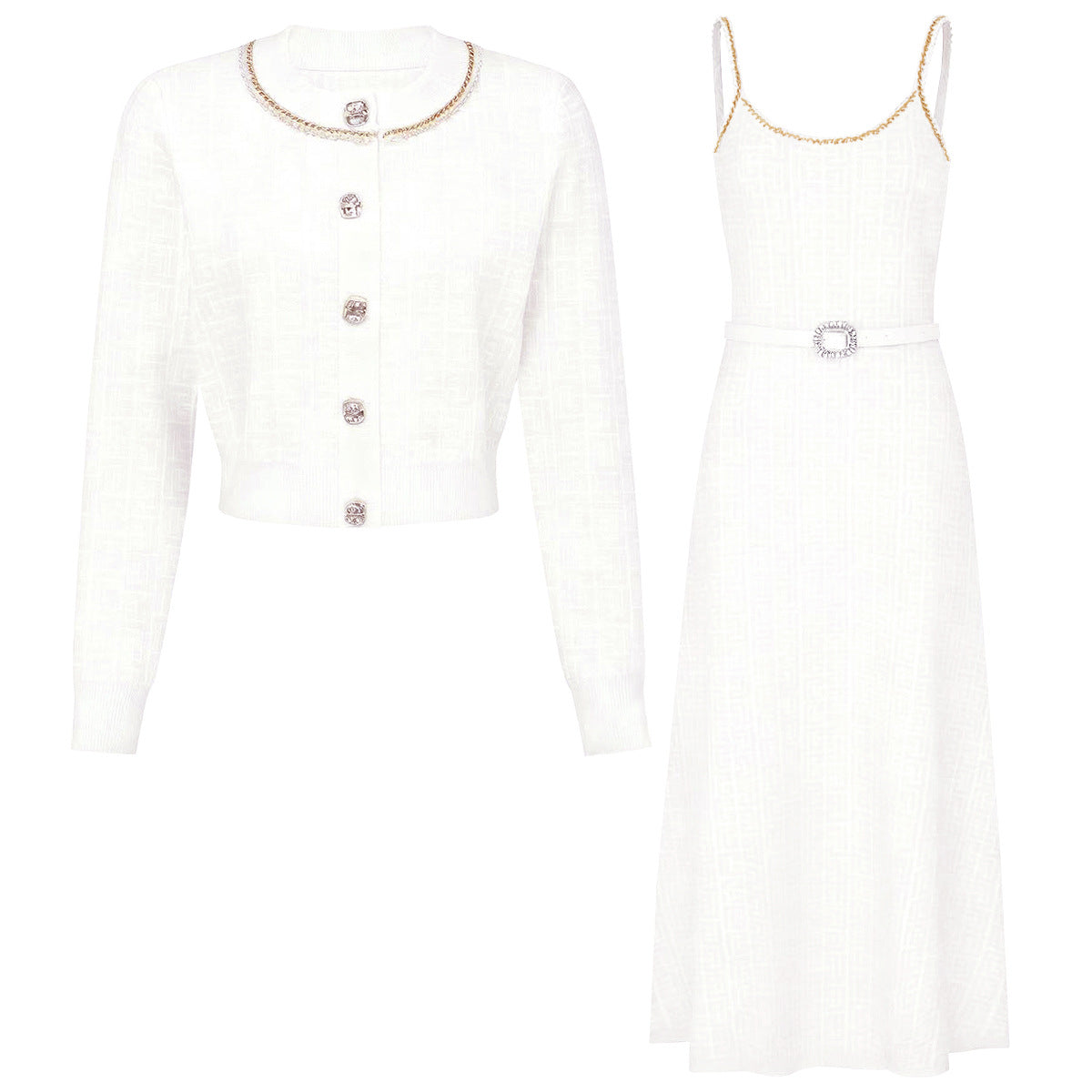 elegant knitted set featuring a sleeveless midi dress and matching cropped cardigan, both detailed with a geometric logo pattern and gold-tone buttons — timeless sophistication with a modern twist. Fabric name: viscose fiber Size Bust (cm) Waist (cm) Hips (cm) Shoulder (cm) Length (cm) Sleeve (cm) 2XS 80 68 — 35 46 56 XS 84 72 — 36 47 57 S 88 76 — 37 48 58 M 92 80 — 38 49 59 Size Bust (cm) Waist (cm) Hips (cm) Shoulder (cm) Length (cm) Sleeve (cm) 2XS 72 66 — — 116 — XS 76 70 — — 117 — S 80 74 — — 118 — M 84 78 — — 119 —