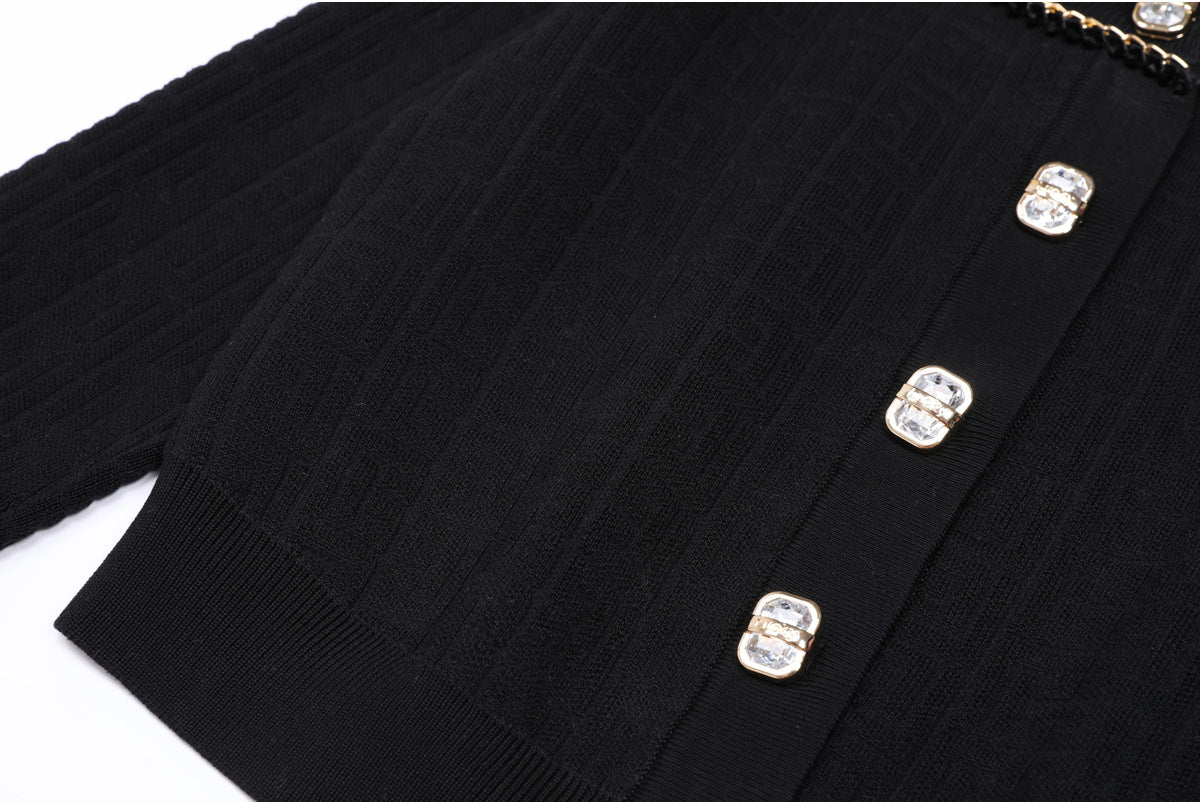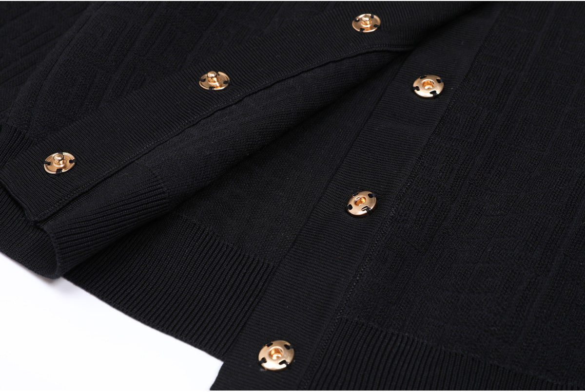 elegant knitted set featuring a sleeveless midi dress and matching cropped cardigan, both detailed with a geometric logo pattern and gold-tone buttons — timeless sophistication with a modern twist.