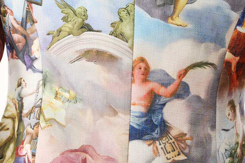 An elegant jacket featuring a vibrant baroque print. Featuring neat tailoring, a single-button fastening, and tie cuffs, it combines classic artistry with modern sophistication.