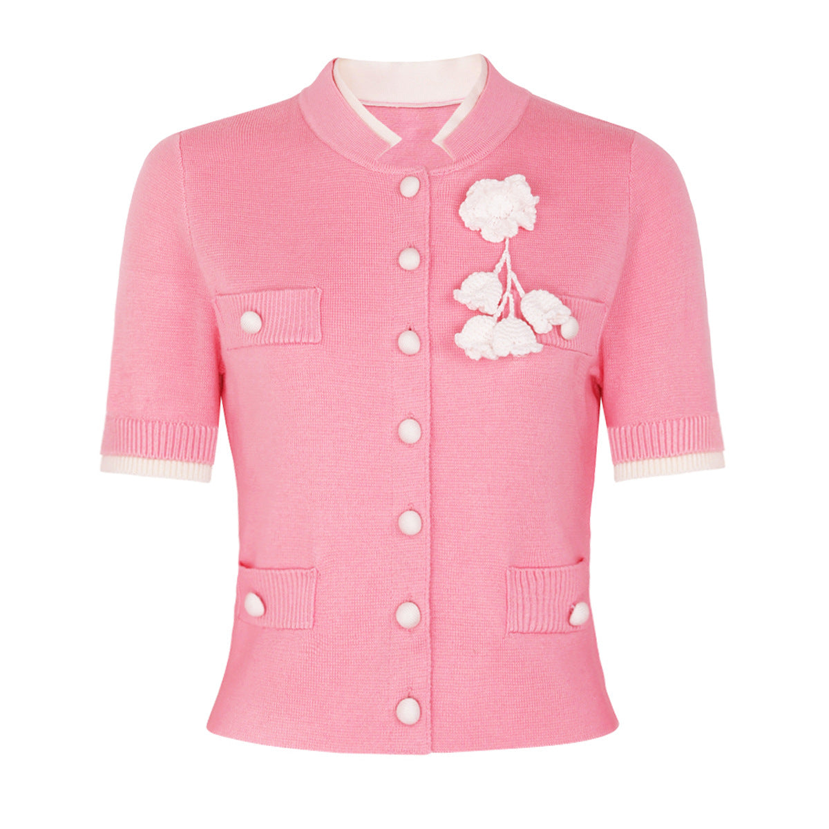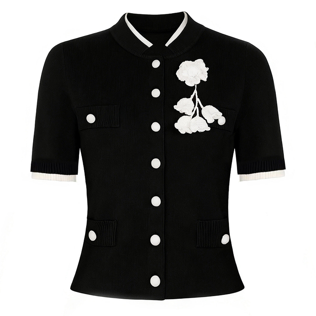 This stylish short-sleeved knit jacket features a sleek design, front buttons, and delicate floral embroidery for a feminine touch. A versatile piece that combines elegance and everyday comfort. Fabric name: viscose fiber Size Bust (cm) Waist (cm) Shoulder (cm) Length (cm) Sleeve (cm) Xs 86 72 35 47 22 S 90 76 36 48 23 M 94 80 37 49 24 L 98 84 38 50 25