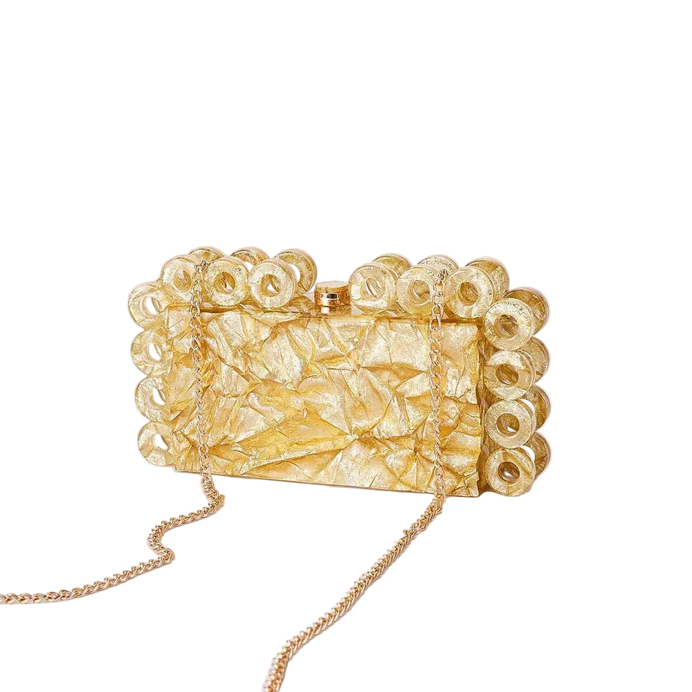 A radiant gold clutch featuring a crinkled textured finish and distinctive circular edge detailing for a sculptural, statement look. Finished with a delicate chain strap, this elegant piece adds refined glamour to evening events, weddings, and special occasions.