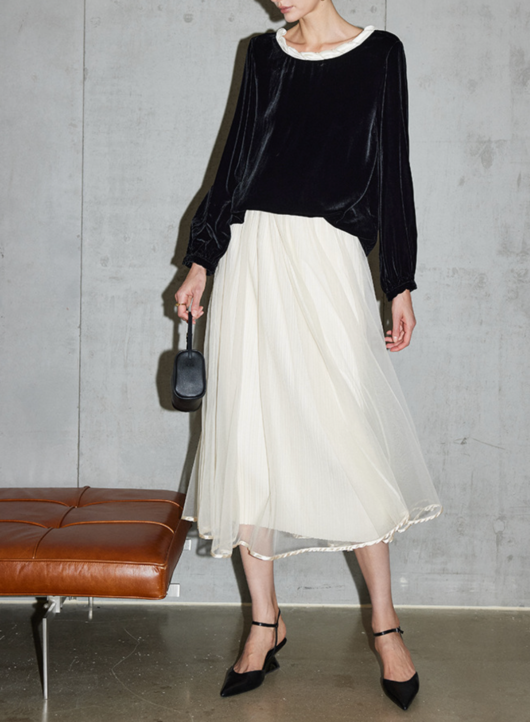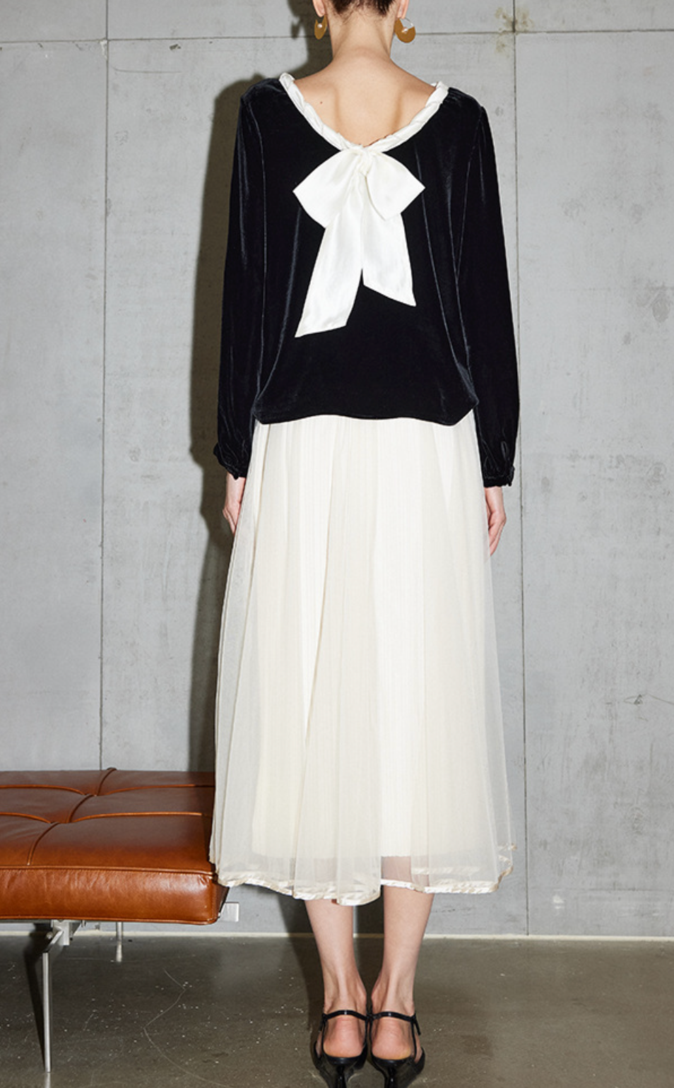 Elegant black velvet blouse featuring a statement ivory bow at the back for a refined contrast. Designed with a soft drape and feminine silhouette, this piece adds a subtle yet striking touch to evening looks and elevated day styling.