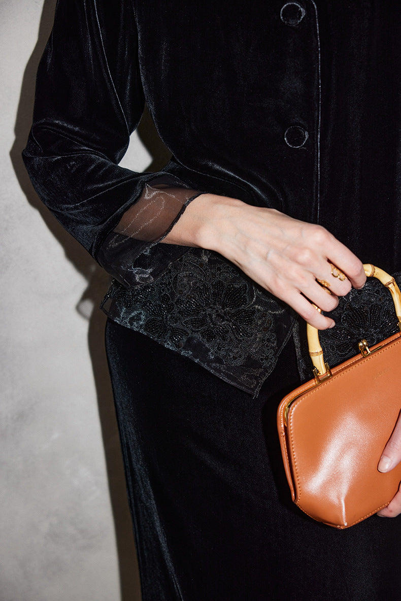Elegant black velvet jacket designed with a deep V neckline and a refined button-front closure. Finished with a delicate sheer lace hem for a soft, feminine contrast—perfect for evening looks, formal occasions, or elevated layering. Fabric: Silk Velvet Size: Size Length (cm) Bust (cm) Shoulder (cm) Sleeve Length (cm) S 55.5 99 38 56.5 M 56.5 103 39 57.5 L 57.5 107 40 58.5 XL 58.5 111 41 59.5