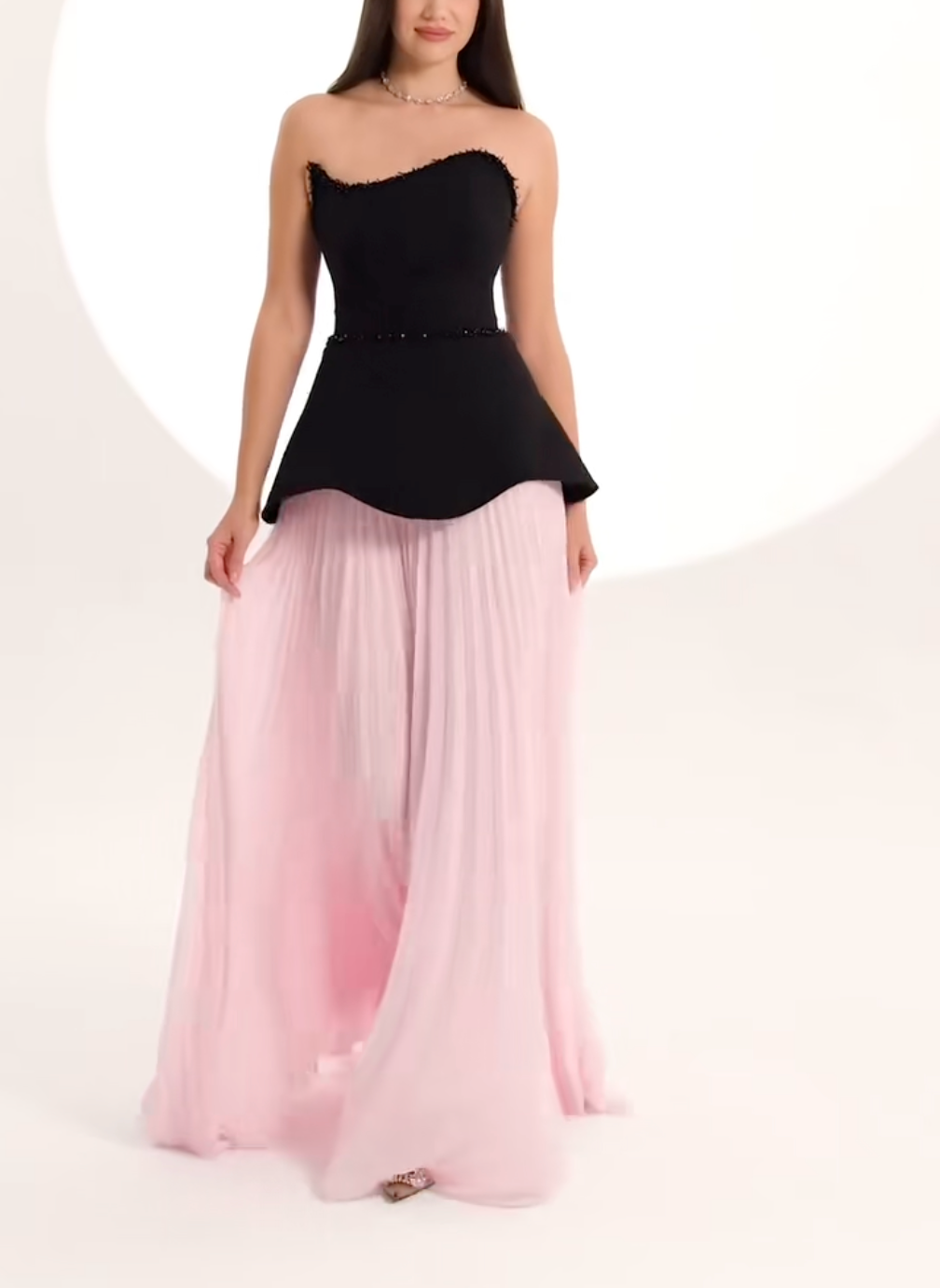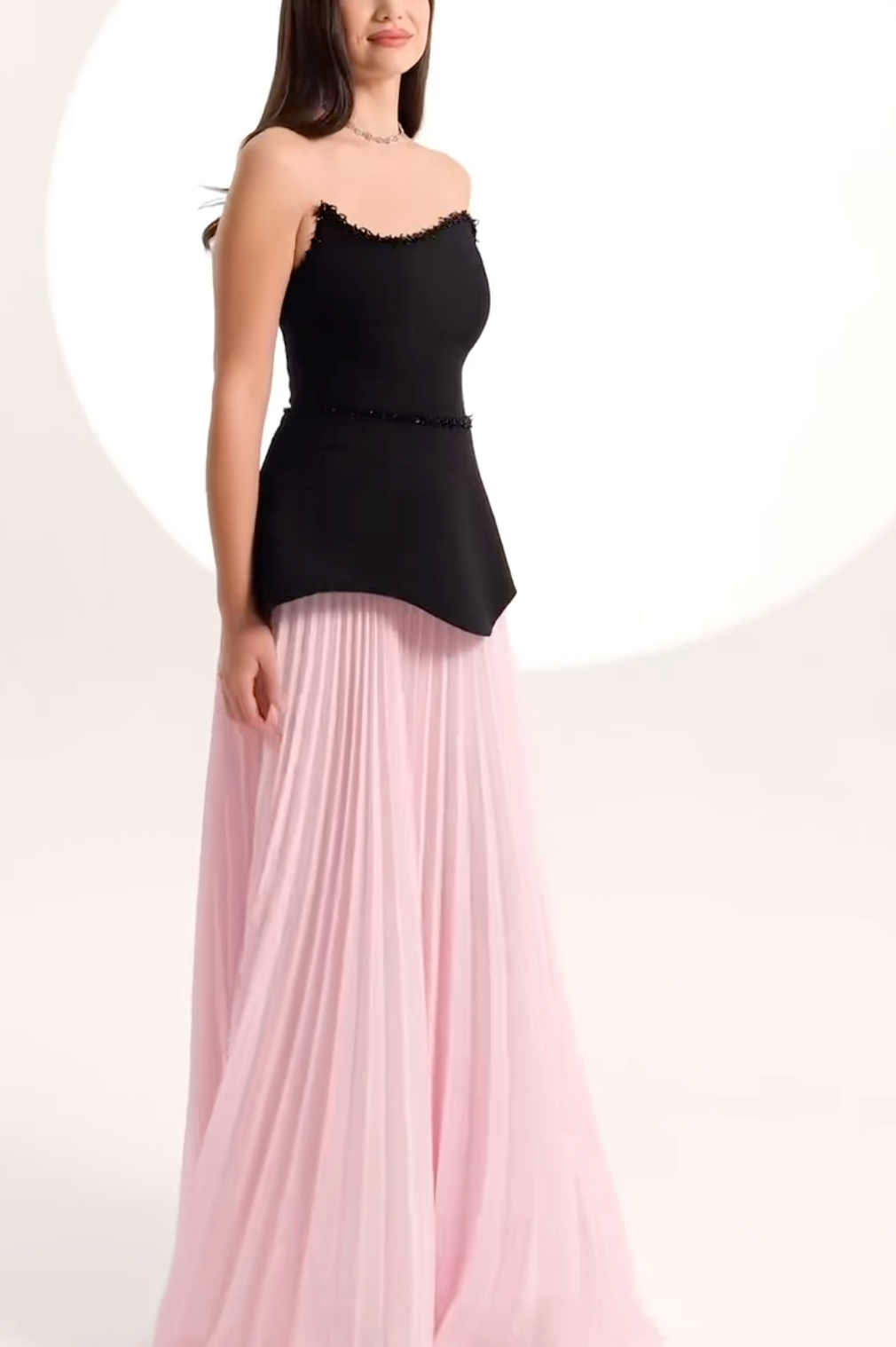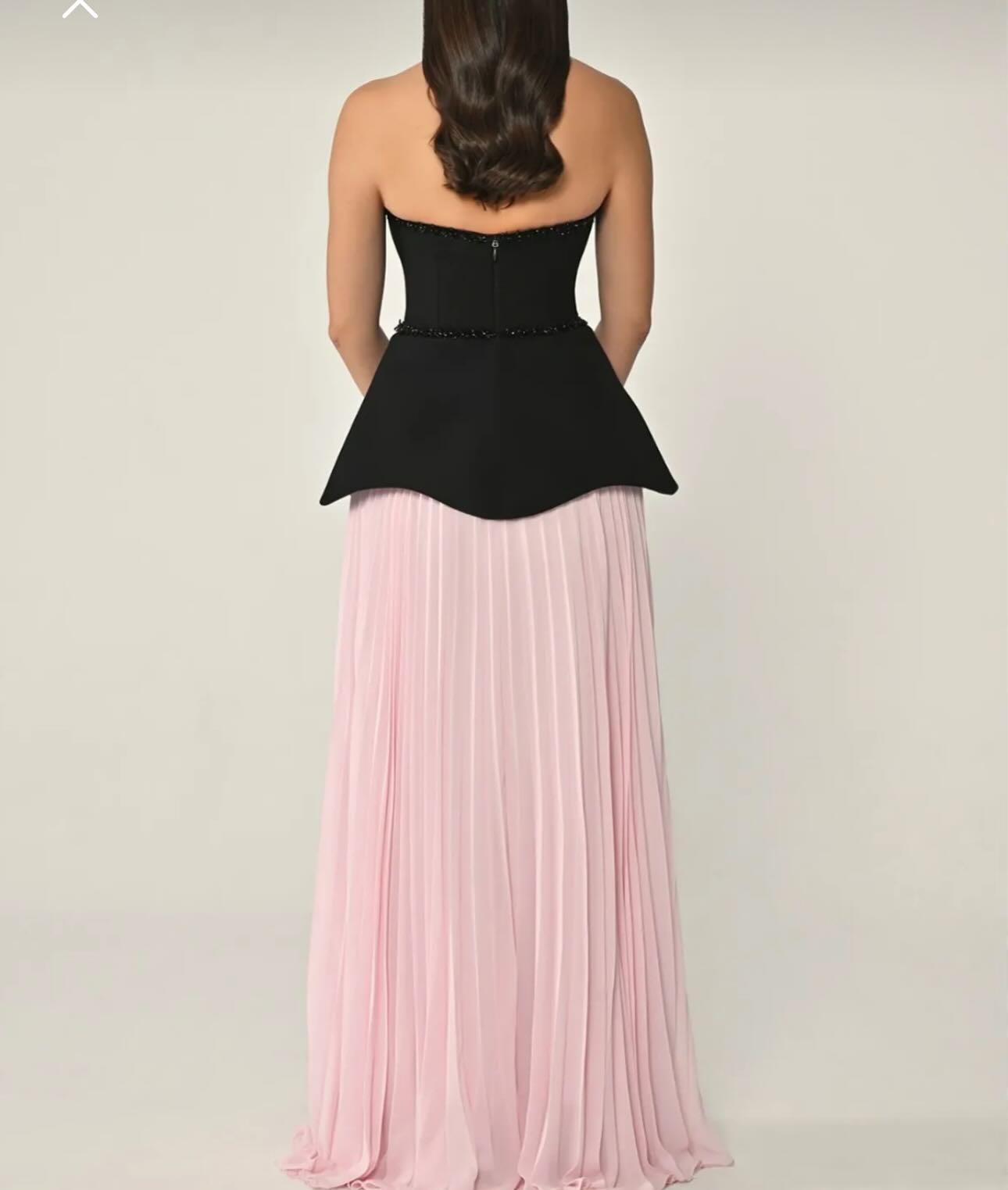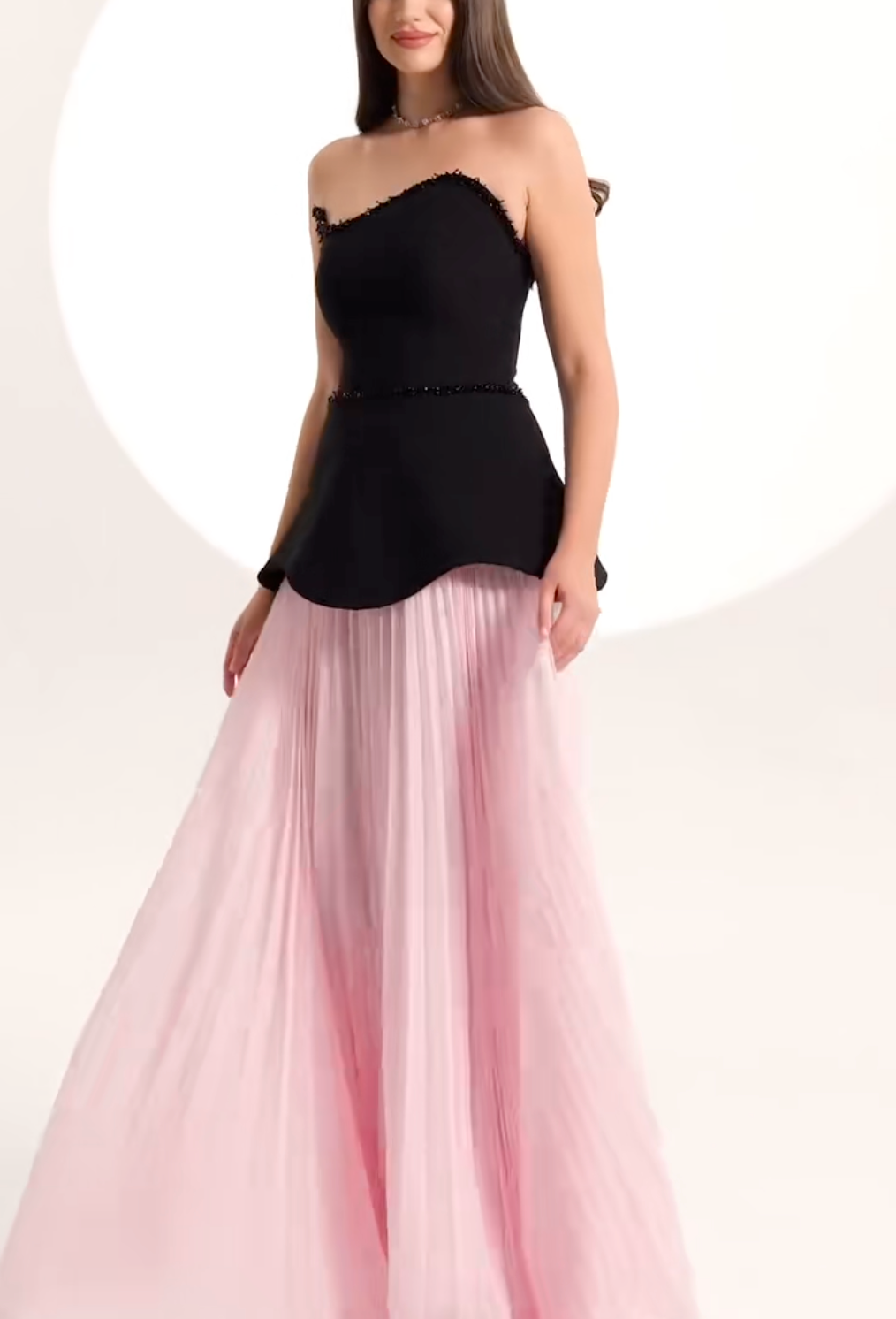A refined blend of contrast and texture, this strapless gown features a structured black bodice with delicate bead trim, paired with a soft blush pink pleated skirt. The sculpted waistline enhances the silhouette, offering a sophisticated yet romantic look perfect for elegant soirées, galas, or formal weddings.