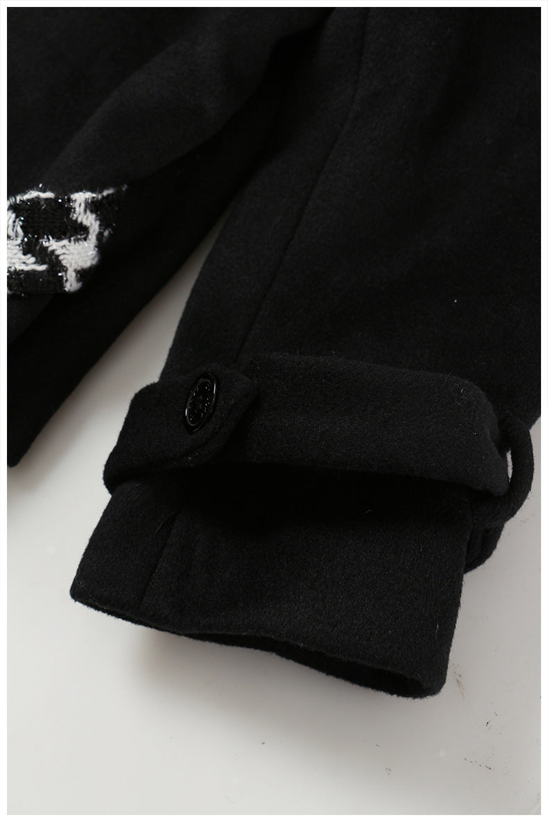 A statement black wool coat accented with bold houndstooth contrast panels for a refined yet edgy look. Designed with an asymmetric wrap front, adjustable waist belt, and cuff detailing, this tailored silhouette delivers warmth, structure, and timeless sophistication—perfect for elevated winter and transitional styling.