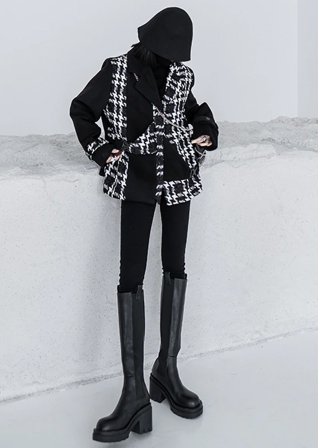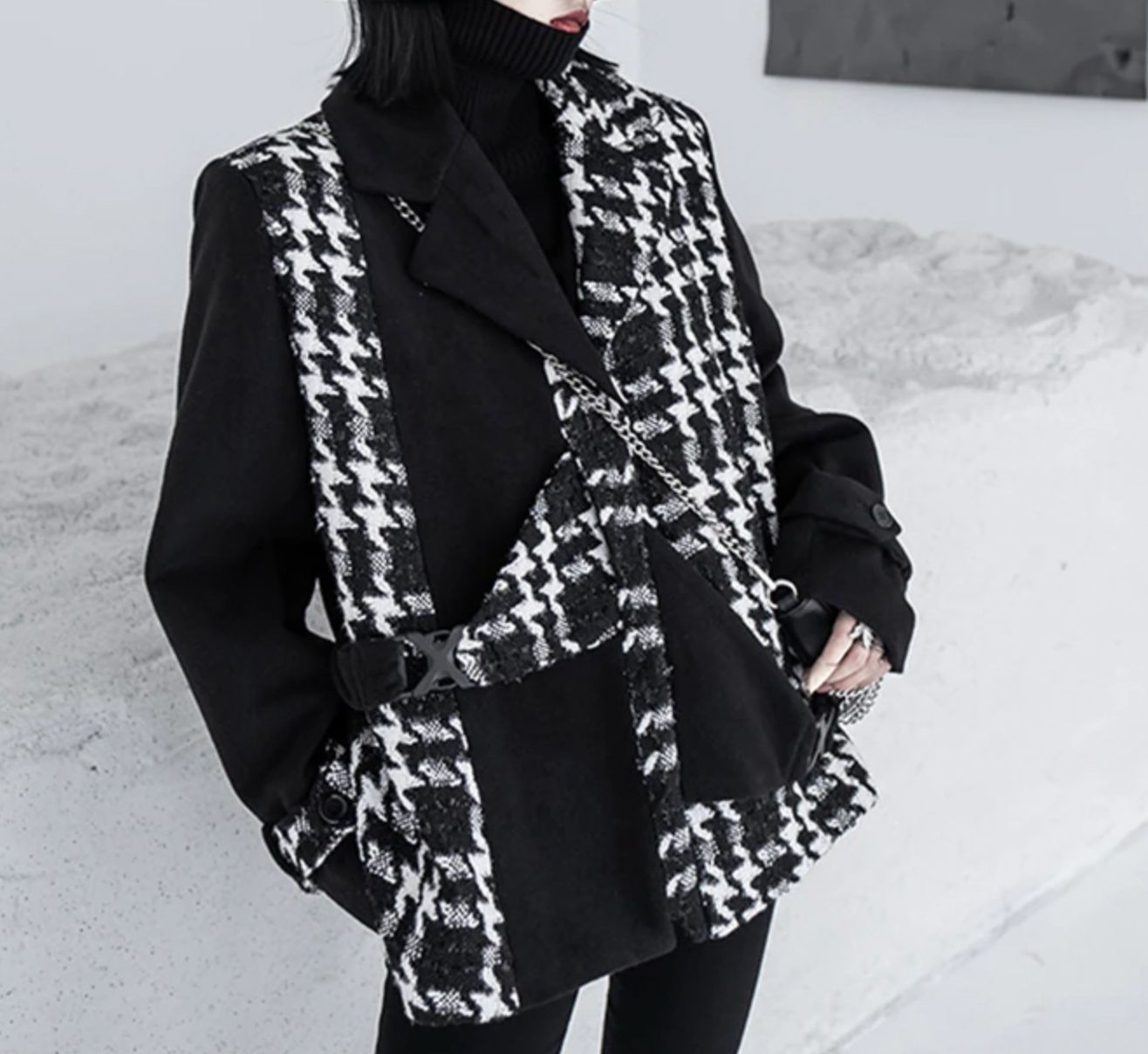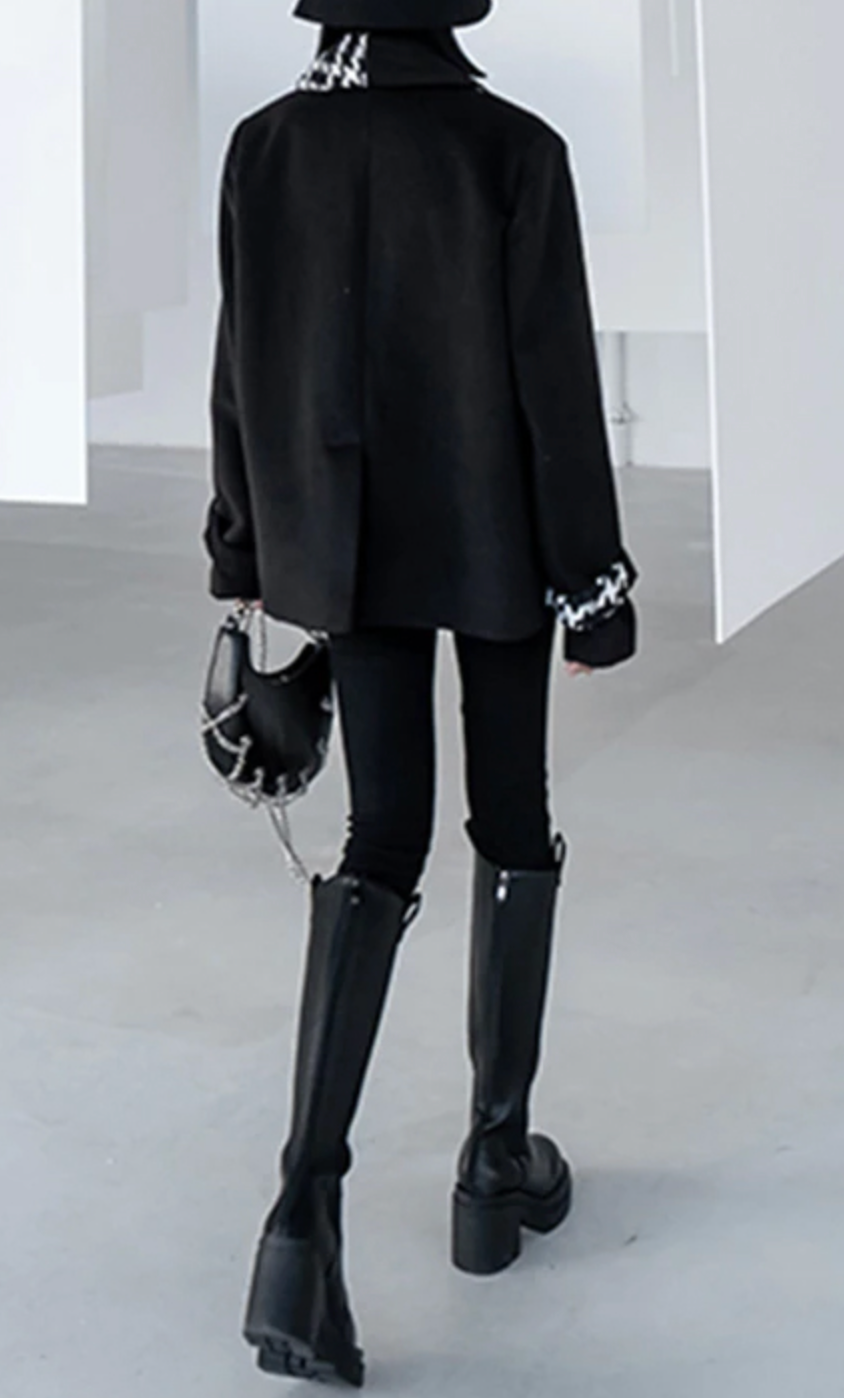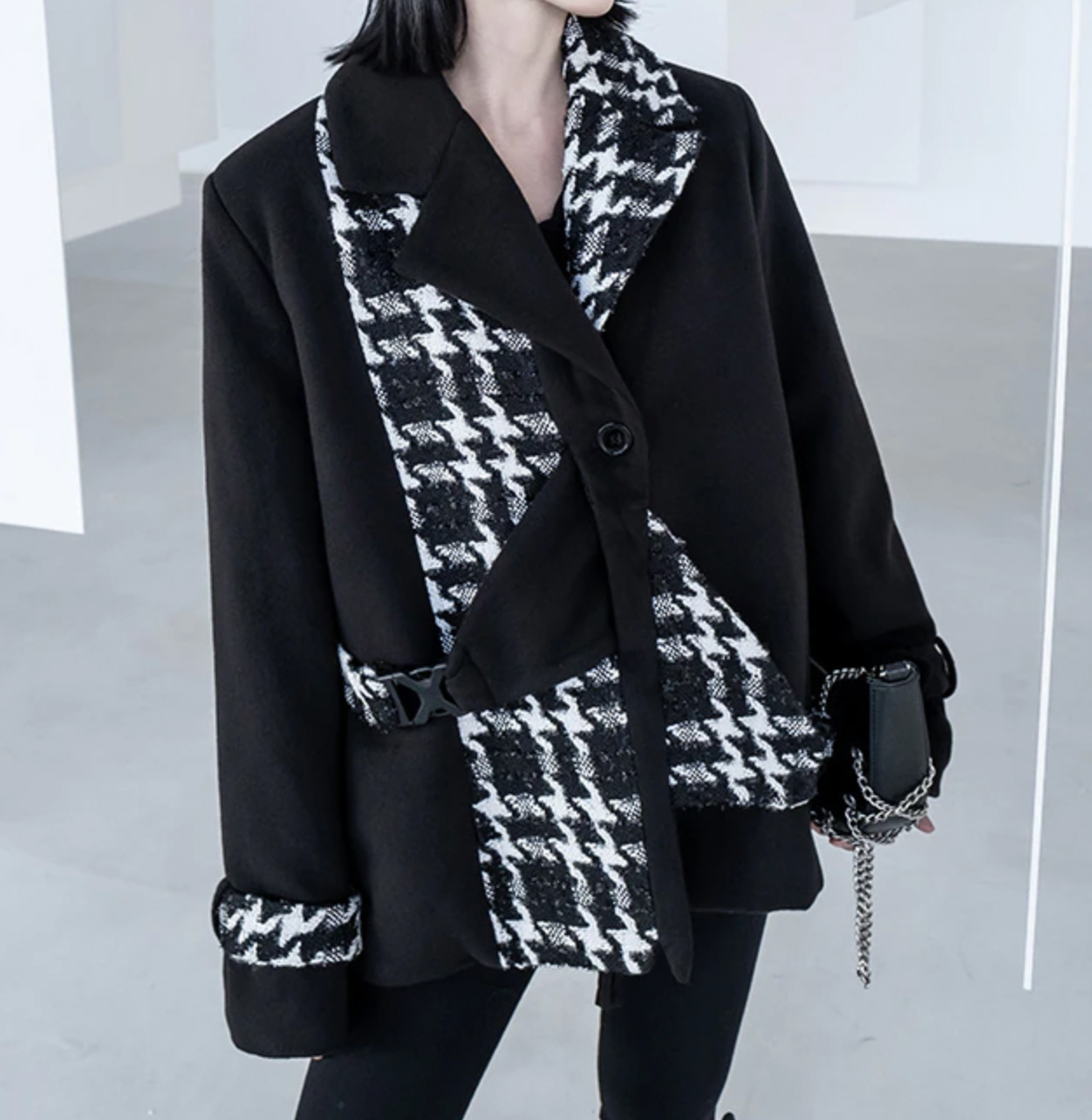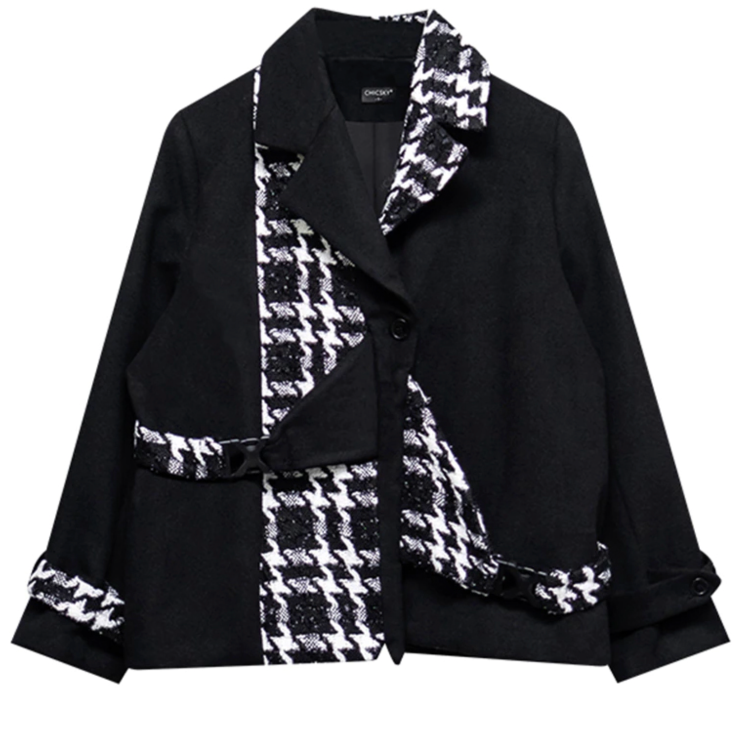 A modern tailored blazer in classic black, elevated with bold houndstooth contrast panels and cuff accents. Featuring a sharp lapel, asymmetric front, and adjustable waist strap for a structured yet contemporary silhouette—perfect for statement city styling and elevated everyday wear.