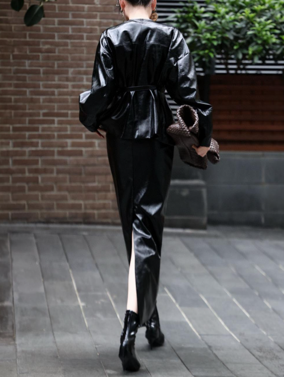 A bold burgundy leather two-piece set featuring a structured peplum jacket with waist-cinching tie detail and a sleek, straight-cut maxi skirt. Designed for confident, high-fashion styling, this look blends modern edge with elevated sophistication—perfect for statement evenings and city chic outfits.
