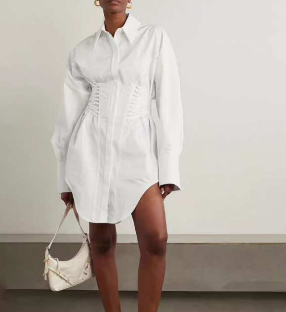 A modern white shirt dress designed with a sculpting corset-style waist that cinches the silhouette while maintaining clean tailoring. Finished with a classic collar, long sleeves, and a softly curved hem, this piece blends crisp minimalism with feminine structure—perfect for chic daytime looks or elevated casual styling.
