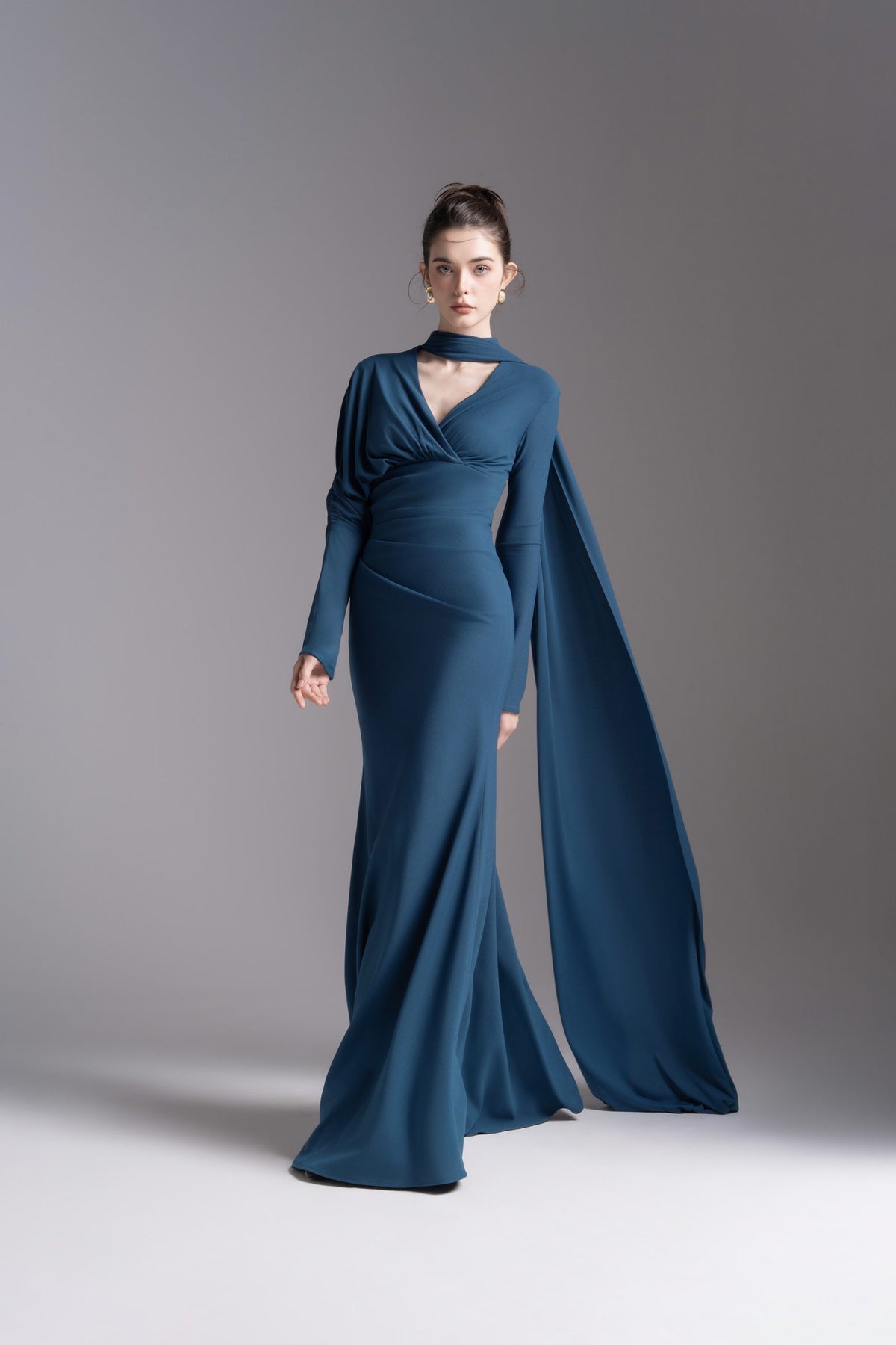 An elegant teal-blue gown featuring a softly draped V-neckline, sculpted waist, and fluid floor-length silhouette. Finished with an attached flowing scarf detail that adds movement and sophistication—perfect for formal evenings or high-end occasions.
