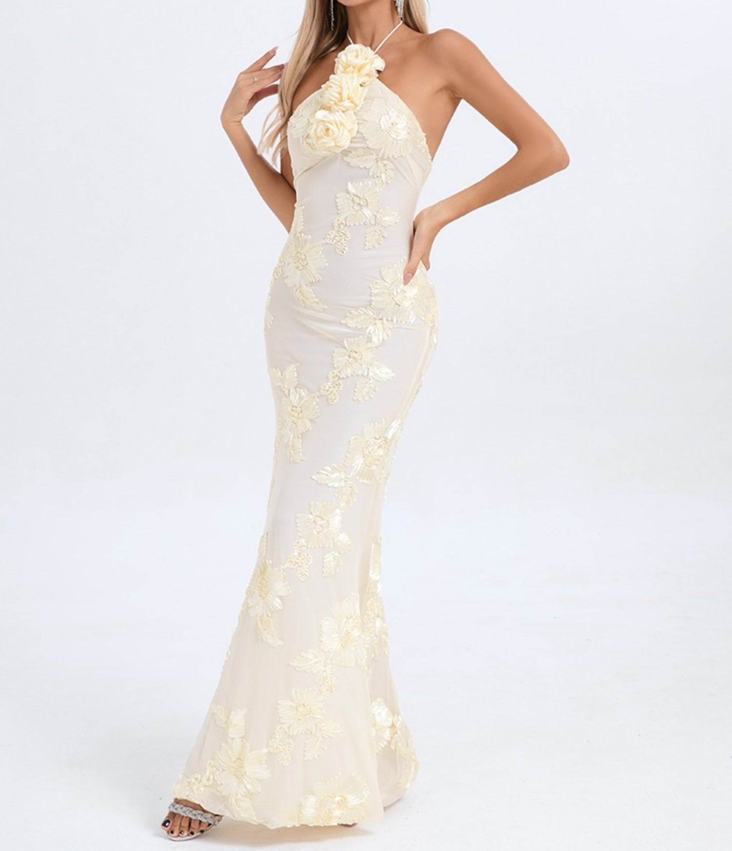 An elegant halter-neck evening gown crafted in a soft ivory tone, featuring delicate floral lace appliqué throughout. Designed with a sculpted, body-skimming silhouette, this gown highlights the waist and flows into a graceful floor-length finish. The floral detail at the neckline adds a romantic statement, making it a perfect choice for formal evenings, weddings, and special occasions where timeless elegance is essential.