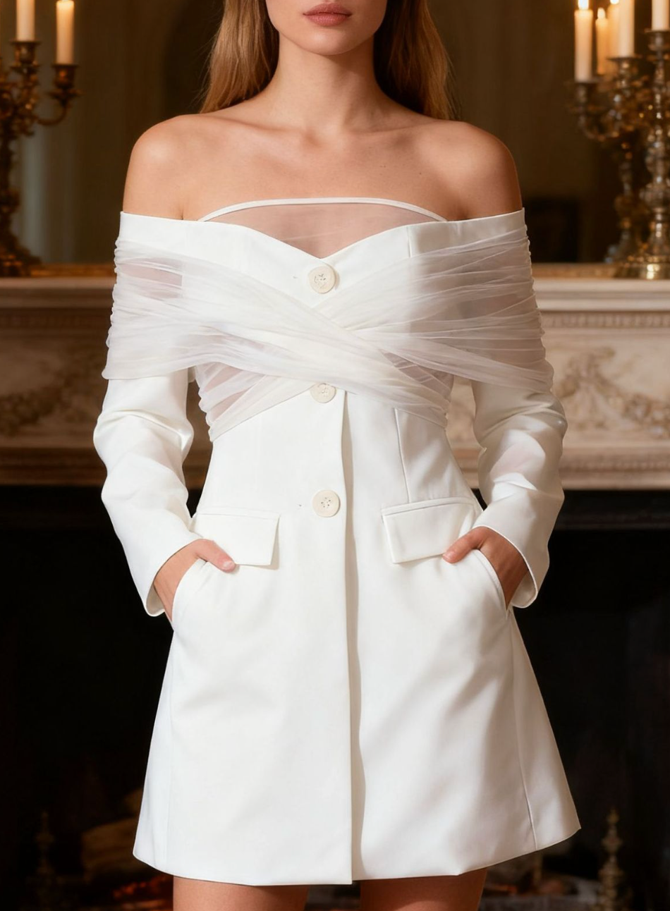 off-shoulder tailored mini blazer dress with tulle wrap – AURORA