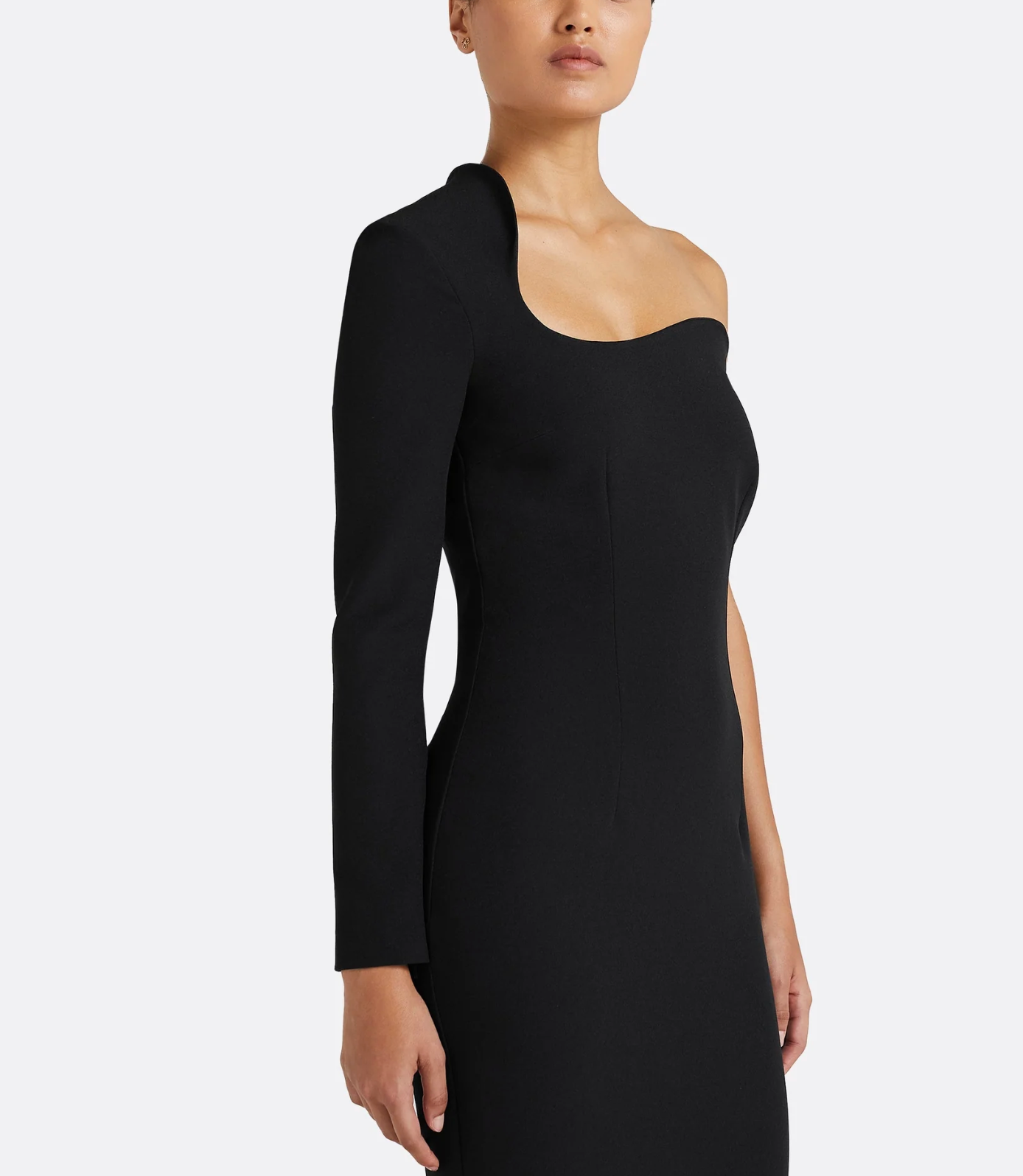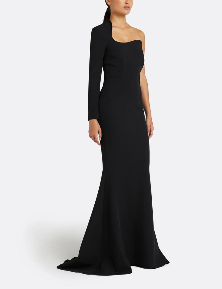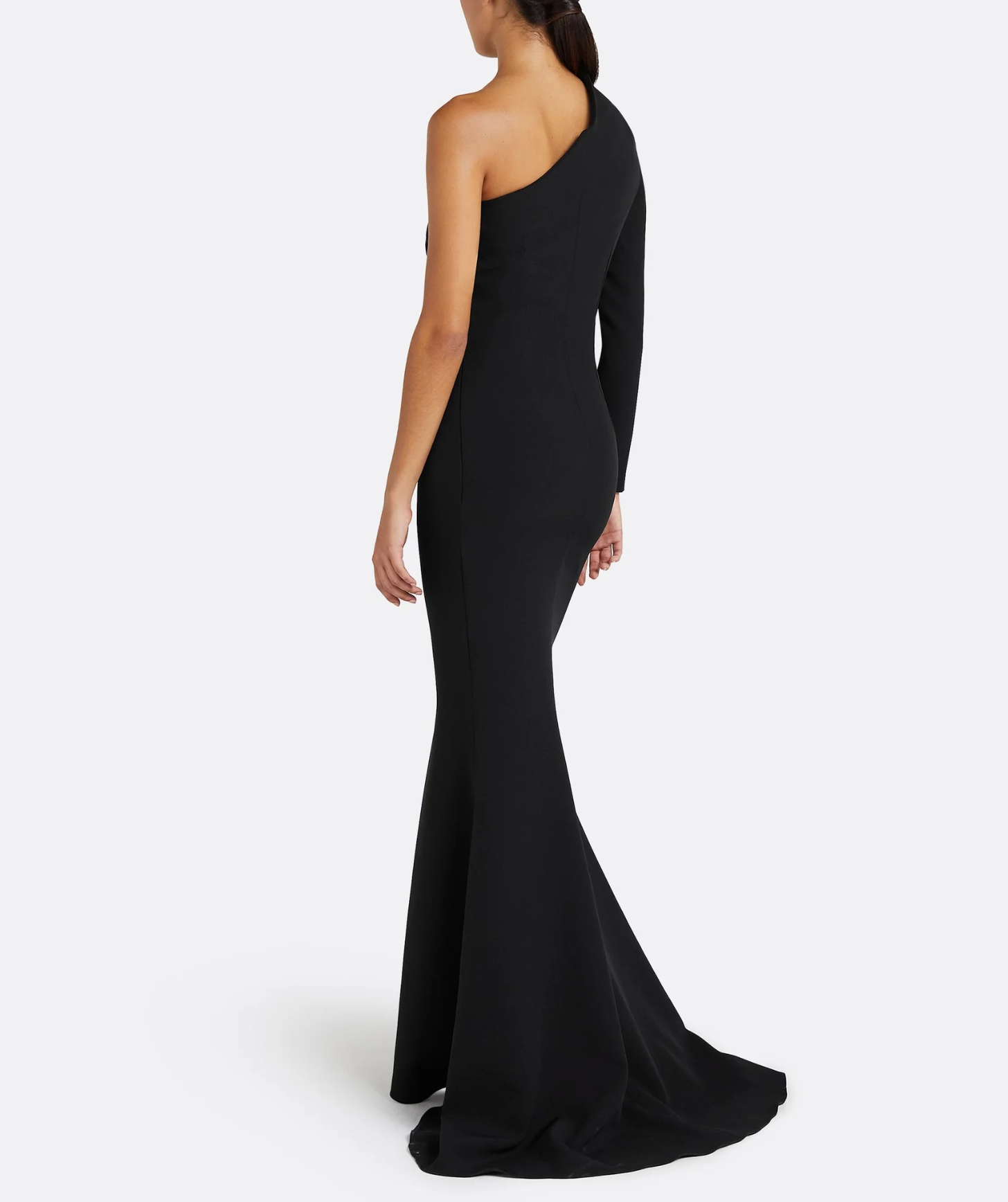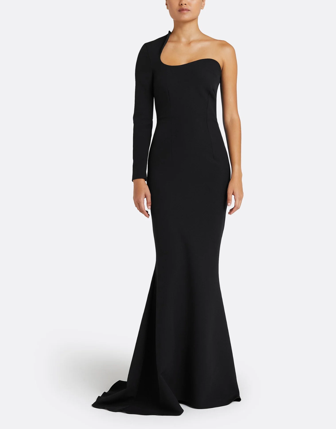 A bold and refined black mermaid gown designed with an asymmetric one-shoulder cut and a softly sculpted neckline. The fitted silhouette flares into a graceful train, perfect for formal evenings and red-carpet moments.