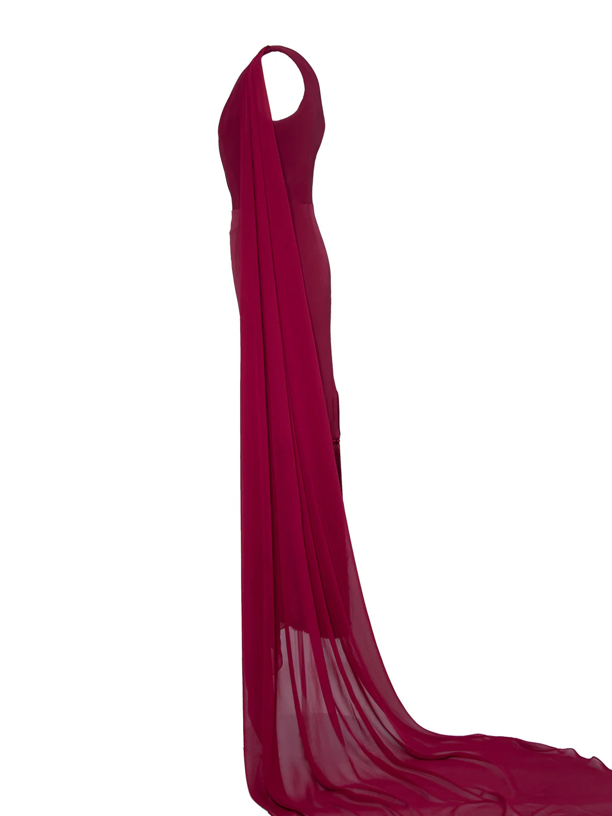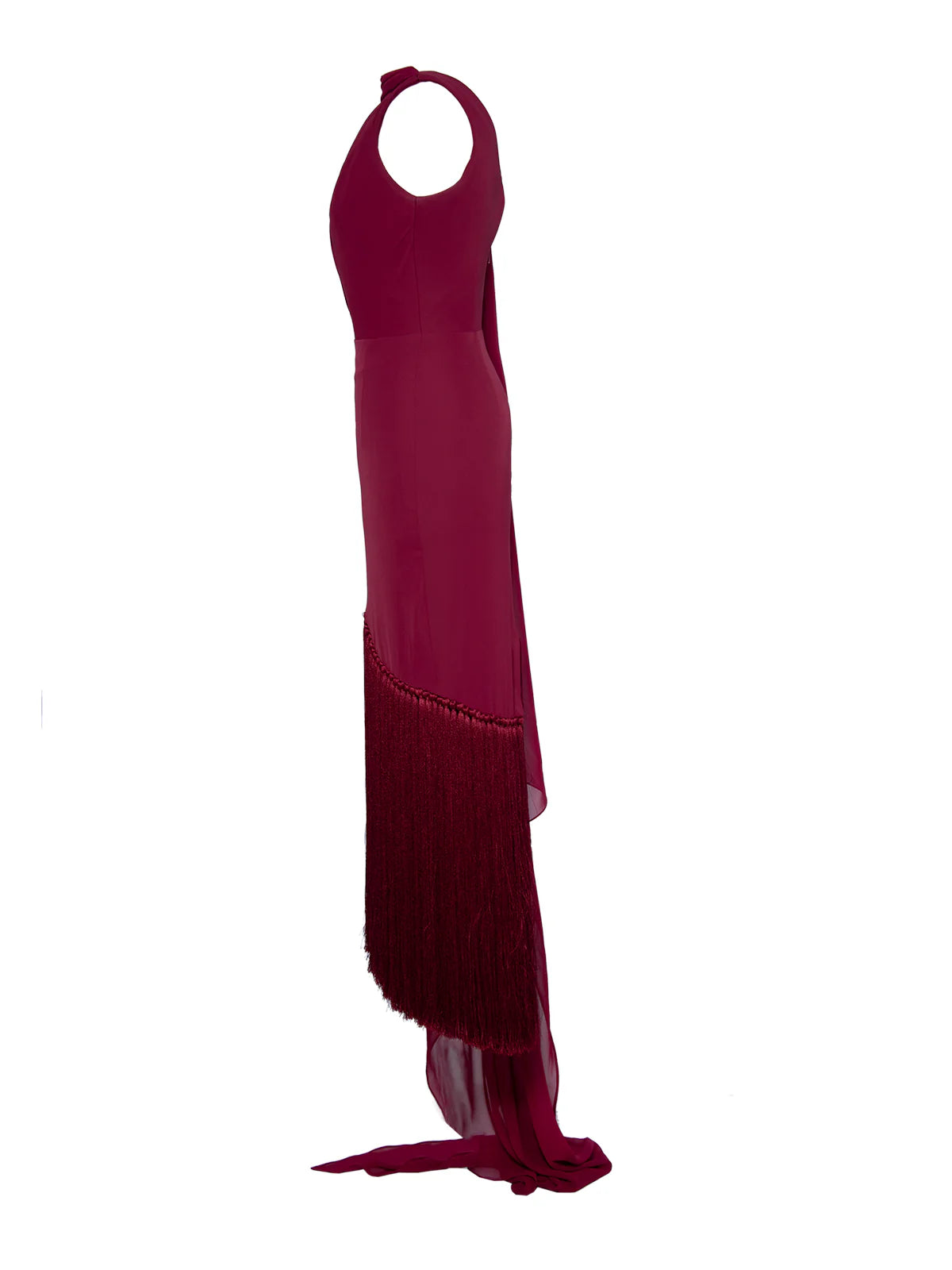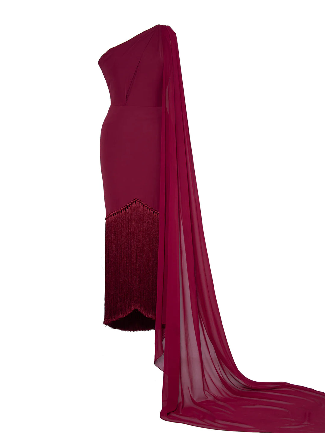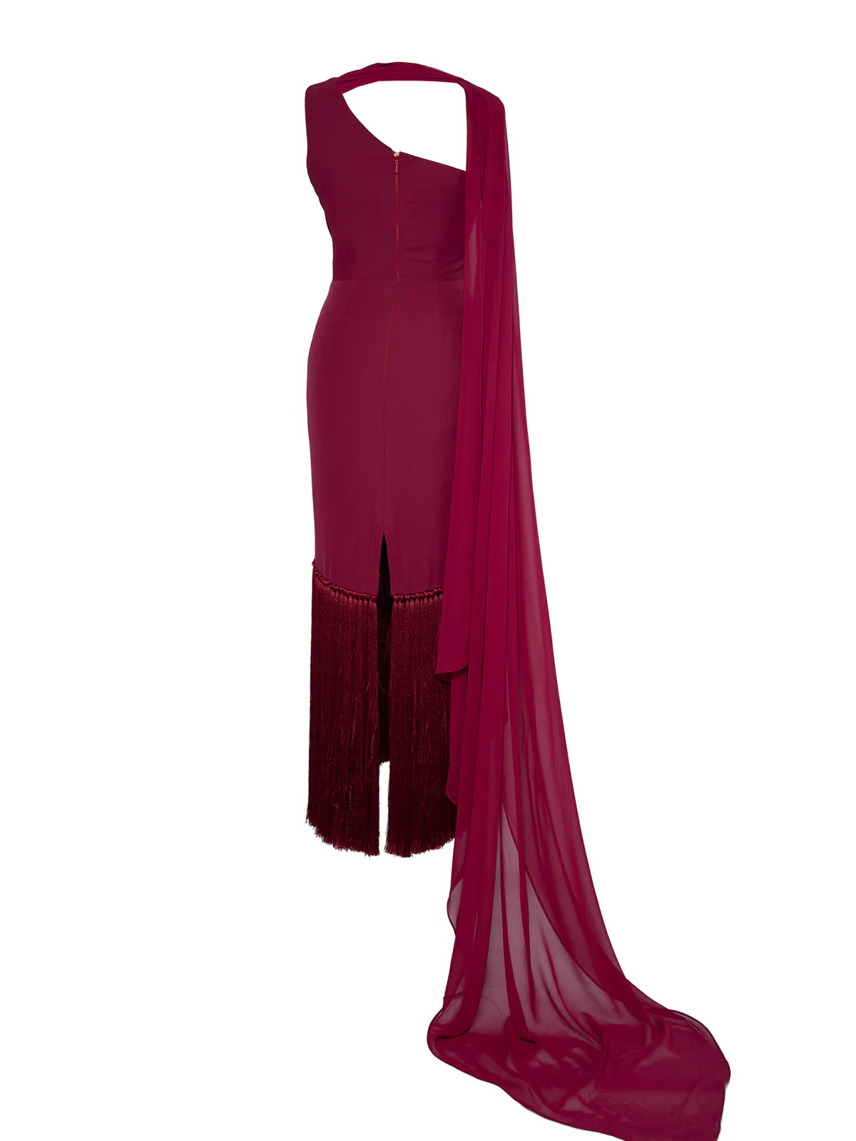 Turn heads in this elegant one-shoulder sheath dress in deep ruby red. Featuring a flowing chiffon sash draped from the shoulder and a striking fringe hem, it blends modern flair with classic charm. The sleek silhouette and bold texture make it perfect for cocktail evenings or special celebrations.