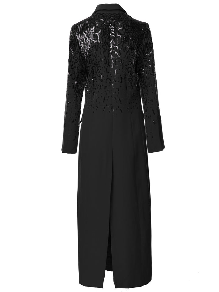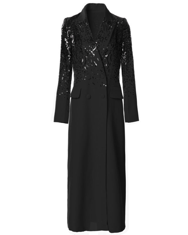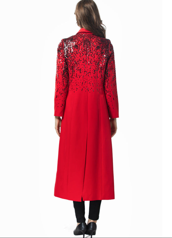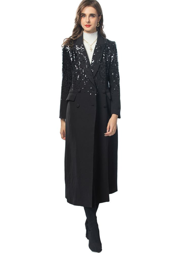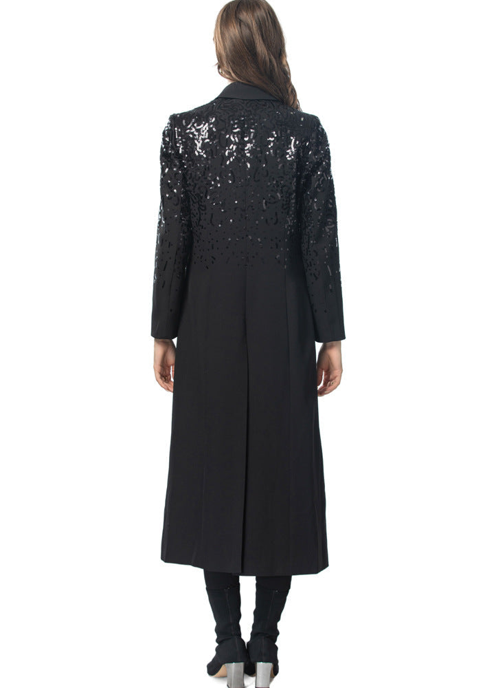 The tailored long jacket, with its intricate design, sharp collar, and dazzling sequin embroidery on the shoulders and sleeves, is a perfect fit for elegance and eye-catching.