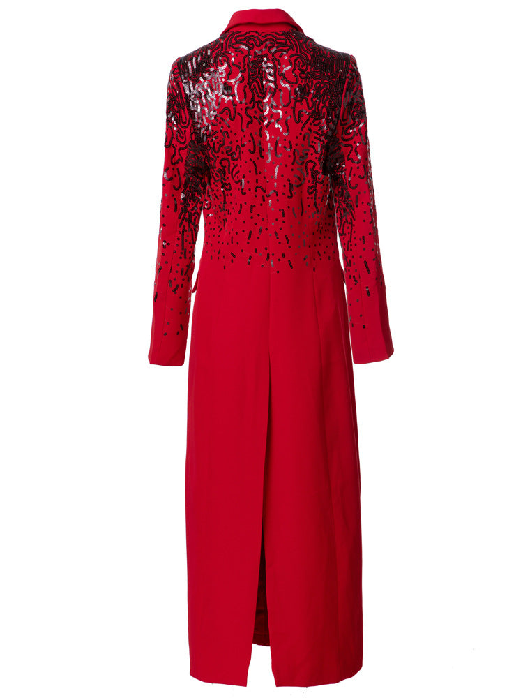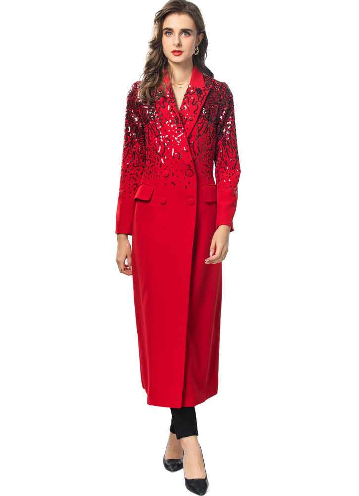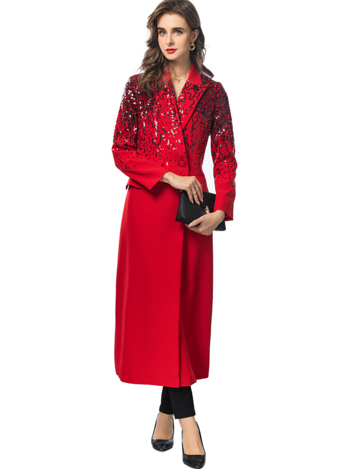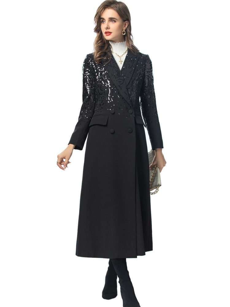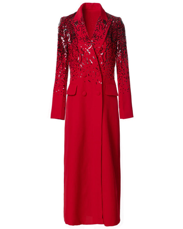 The tailored long jacket, with its intricate design, sharp collar, and dazzling sequin embroidery on the shoulders and sleeves, is a perfect fit for elegance and eye-catching.
