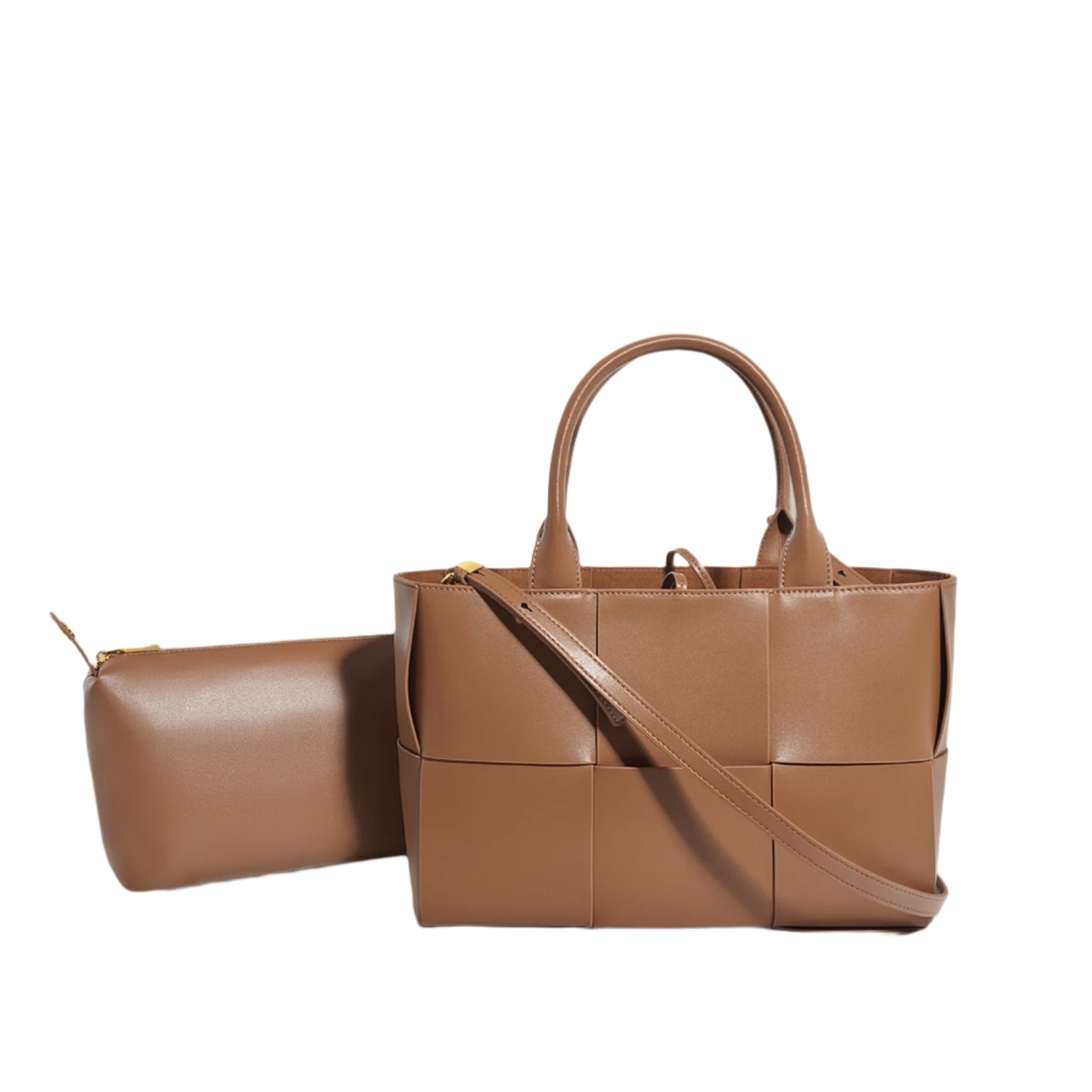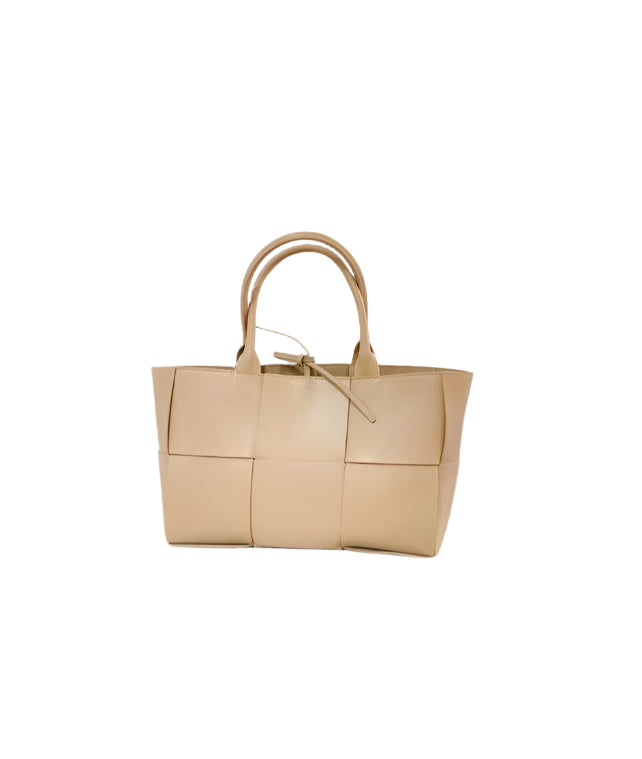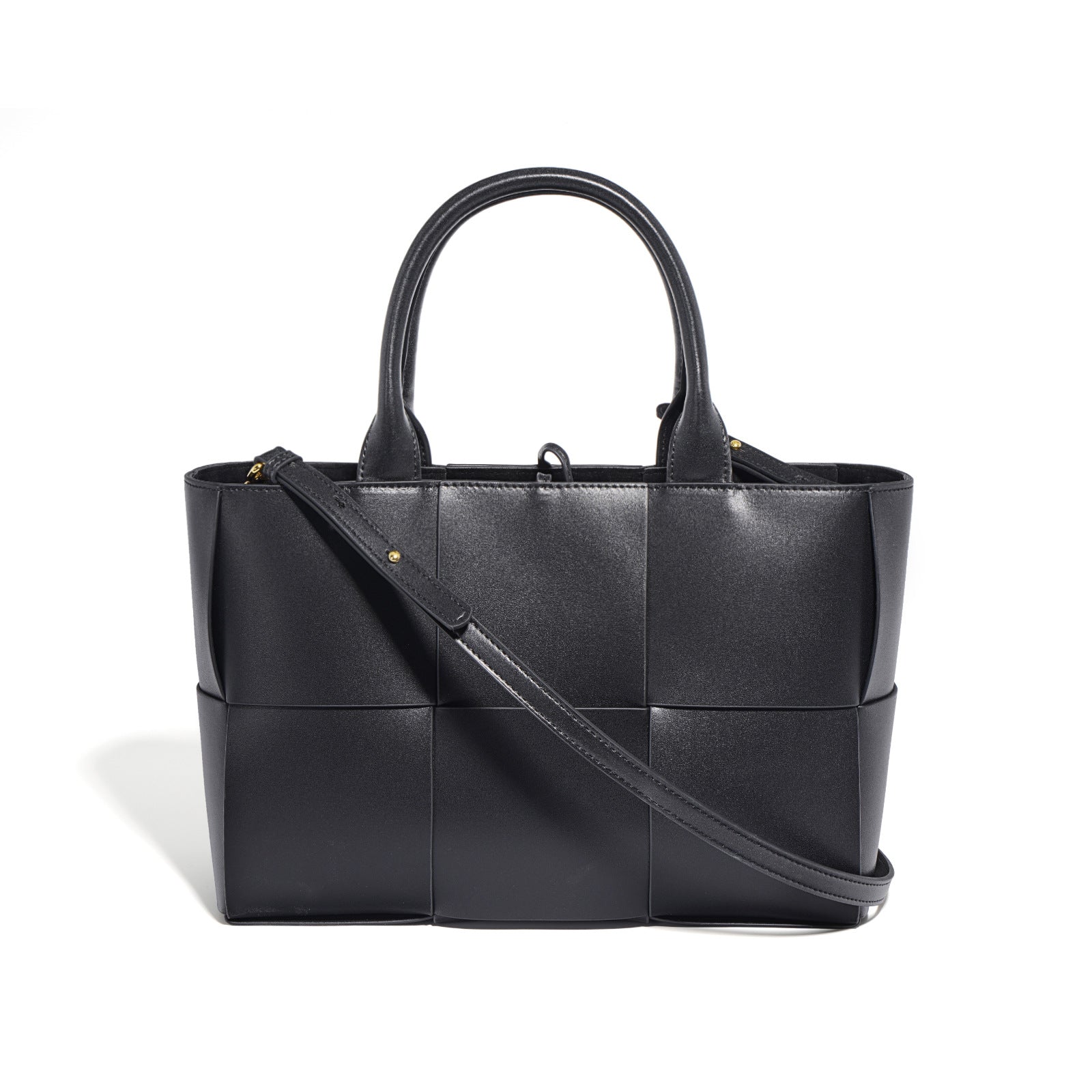 Mühelos skulptural, diese schwarz-weiße gewebte Tasche verfügt über eine geschwungene Silhouette, strukturierte obere Griffe und elegante schwarze Paspeln. Ein leichter, aber auffälliger Begleiter für Ihre täglichen Essentials.