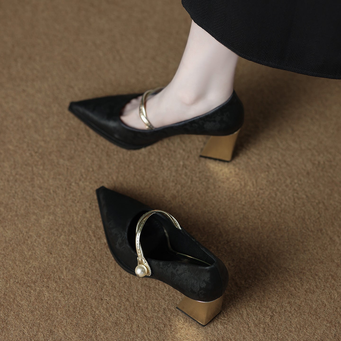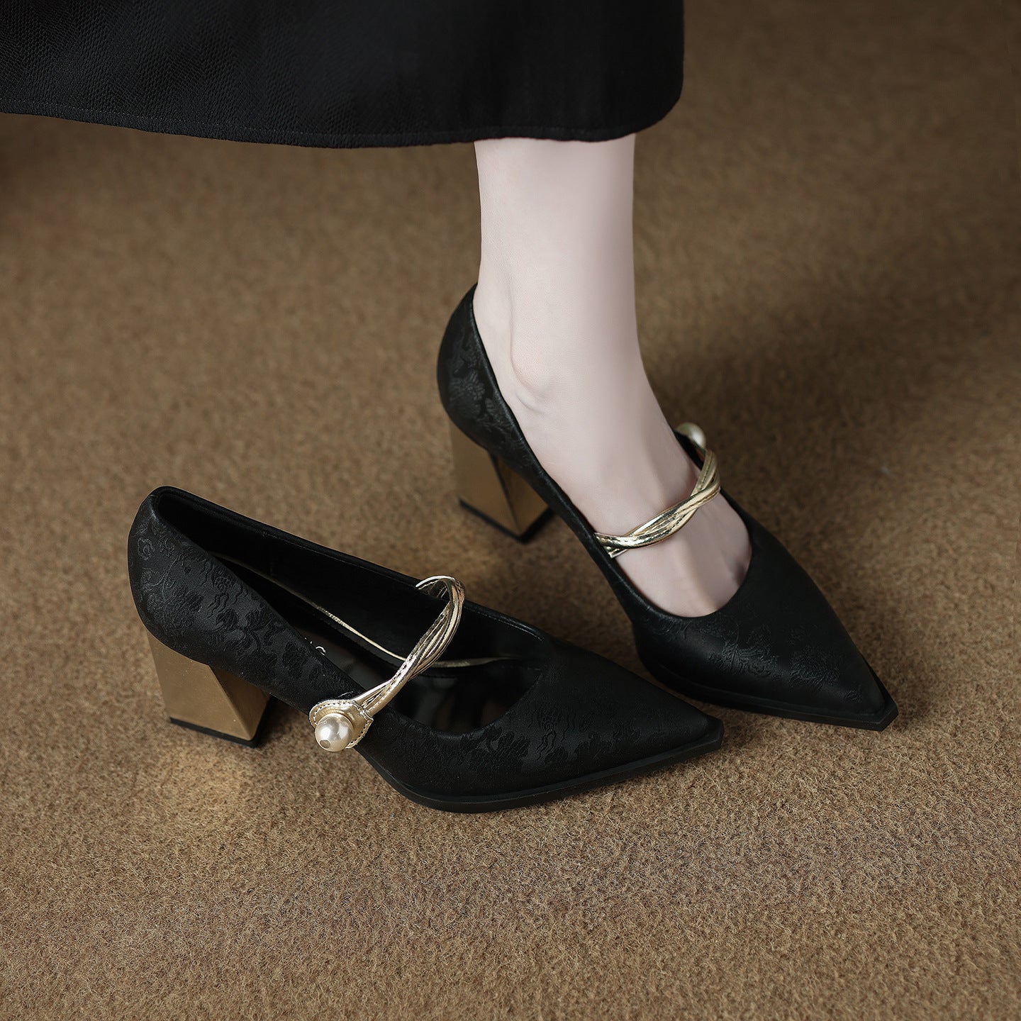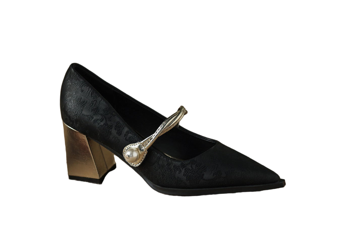 Cette élégante et sophistiquée chaussure à bout pointu est confectionnée en cuir verni noir brillant pour un look soigné. La caractéristique signature—une bordure en fourrure grise douce à l'avant—ajoute une touche luxueuse à ce design classique. Conçu avec un talon haut et élancé et une doublure douce de ton doré, ce soulier distinctif combine sans effort élégance et sophistication, que ce soit pour une tenue de soirée ou des occasions sophistiquées.