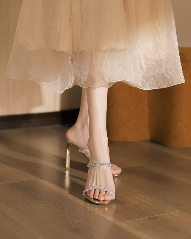 Attractive metallic heel featuring double rhinestone straps and a sleek, high-low design - perfect for special occasions Upper material: Microfiber Sole material: rubber Lining material: PU
