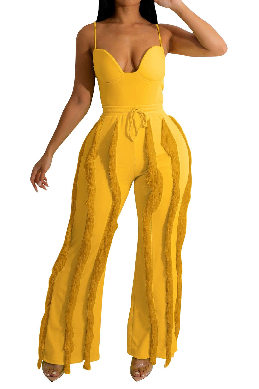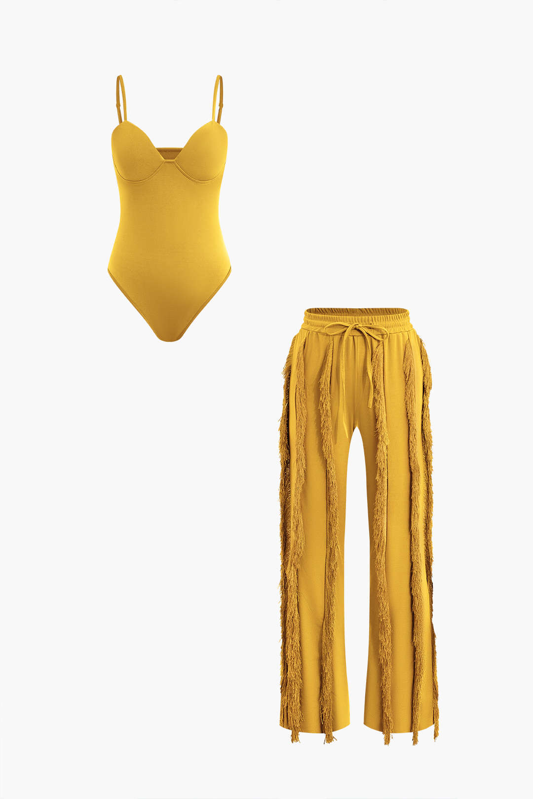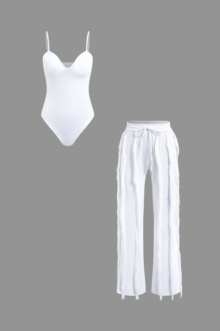 Bustier Slip Bodysuit And Fringe Tie Front Wide Leg Trousers Set