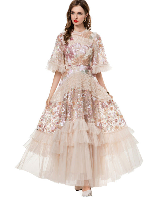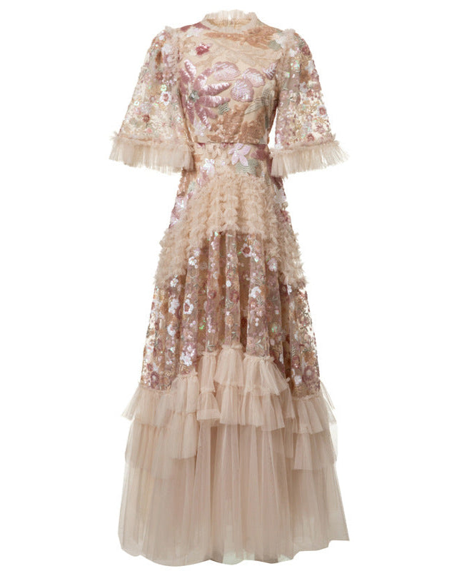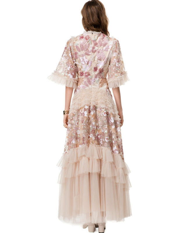 This stunning gown features intricate floral embroidery on sheer tulle, enhanced with delicate tiered ruffles and a draped hem. Its soft pink hue and romantic design exude timeless elegance.