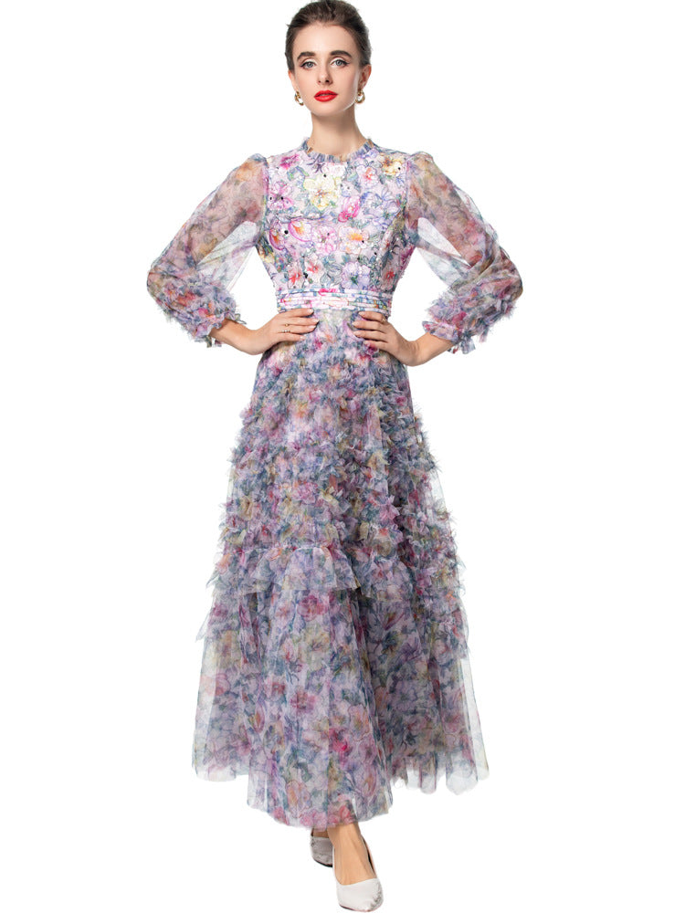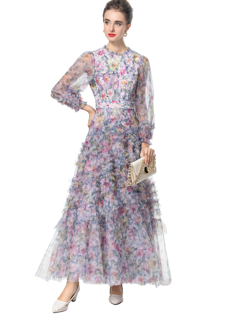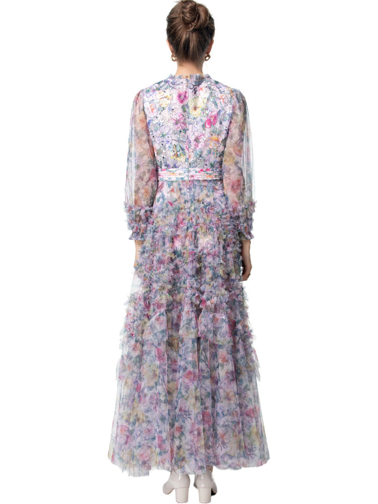 Whimsical and graceful, this pastel-hued gown features a sheer floral tulle overlay with a delicately embroidered bodice. The layered ruffle skirt and long sleeves add soft movement and charm—perfect for garden soirées, weddings, or special occasions.