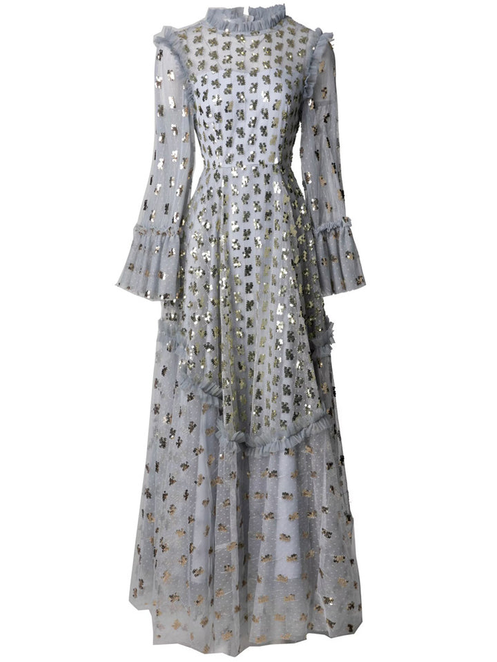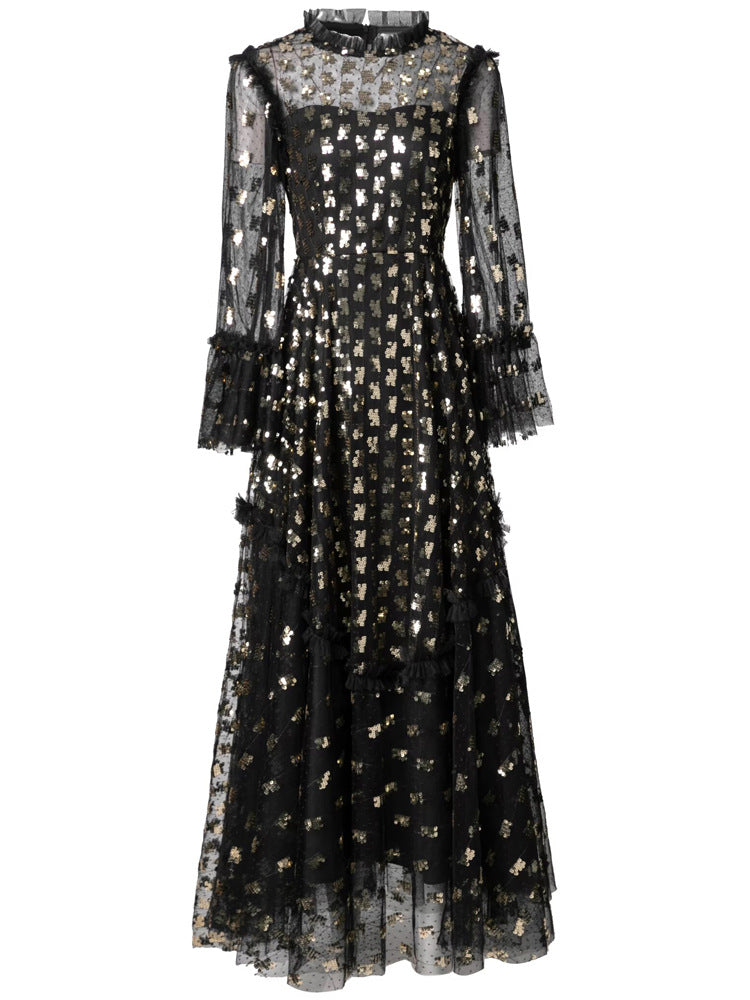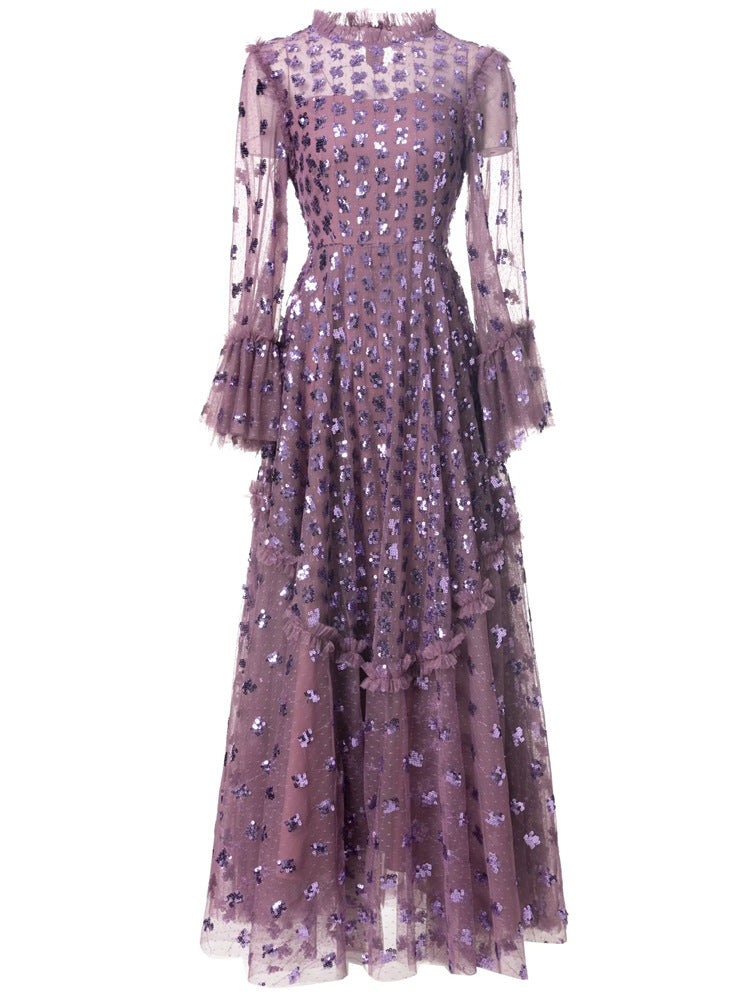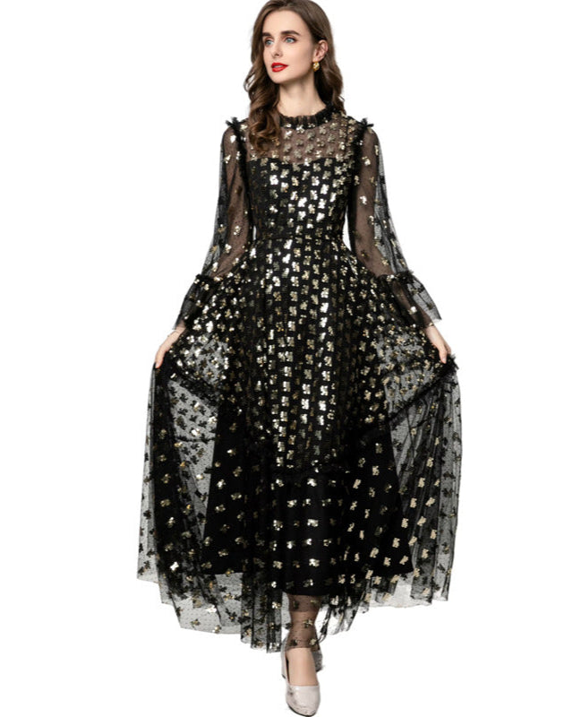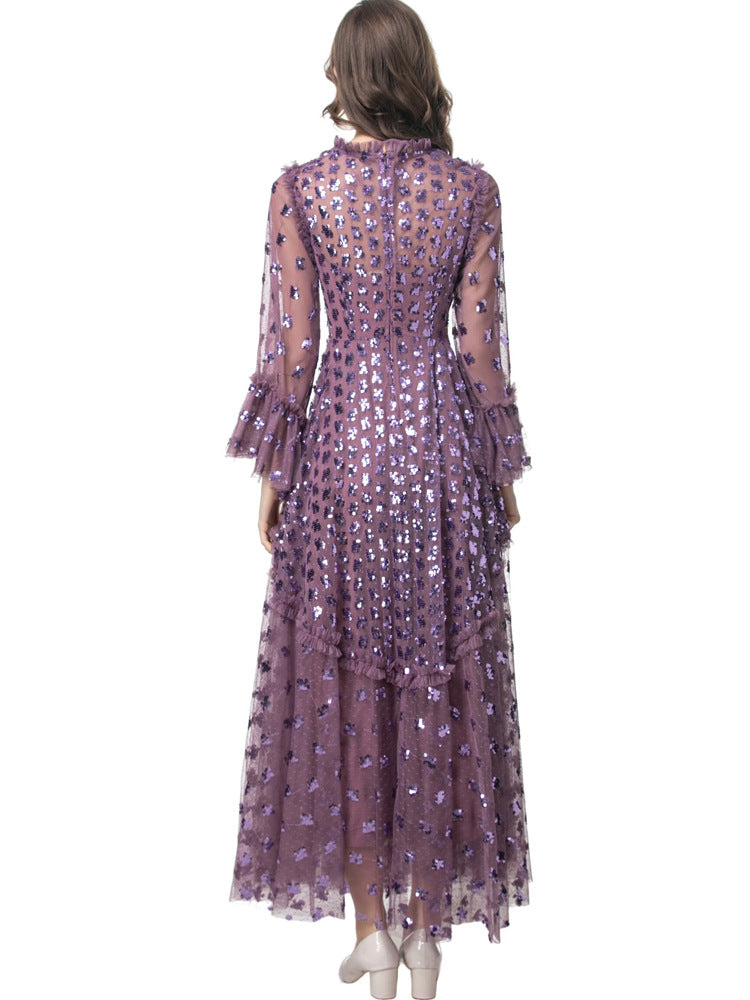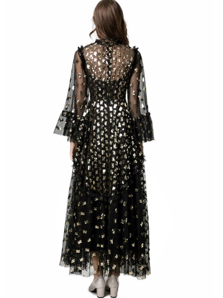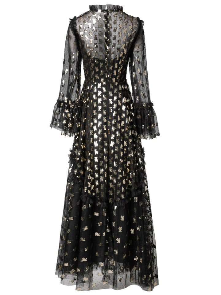 Shine elegantly in this long, ruffled dress made of multi-layered tulle and embellished with metallic sequins. It features a flared design, tiered bell sleeves, and delicate ruffled edges.