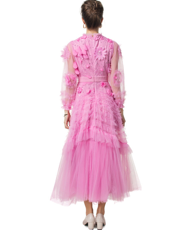 A vibrant pink gown featuring long sheer sleeves, a cinched waist, and cascading layers of tulle embellished with delicate 3D floral embroidery and pearls. Its romantic design and full skirt make it perfect.
