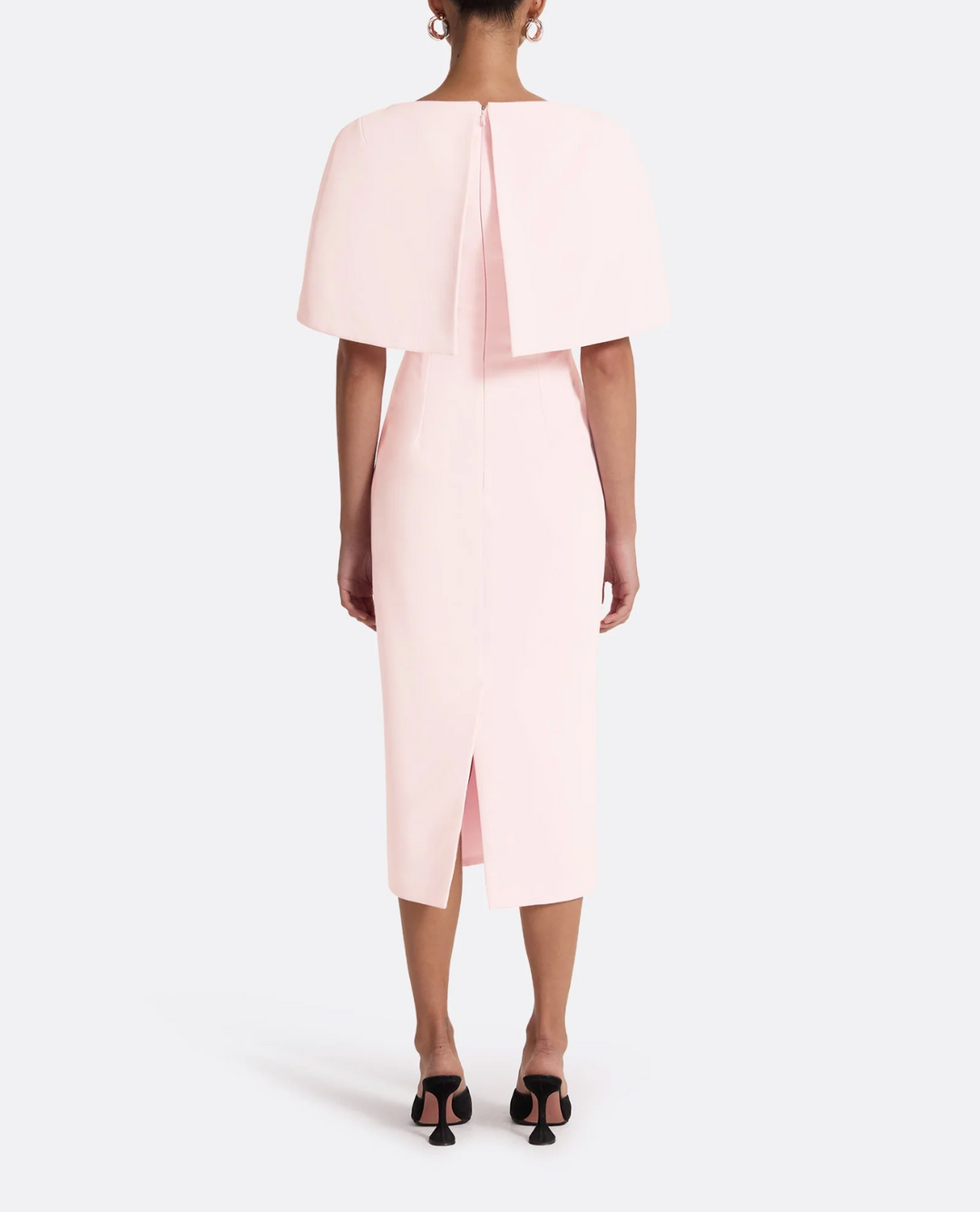 Soft and graceful, this blush pink midi dress features a tailored sheath silhouette topped with a structured cape overlay that drapes effortlessly over the shoulders. A refined choice for daytime elegance or special occasions.