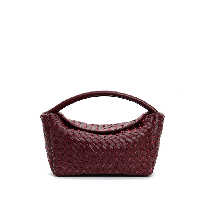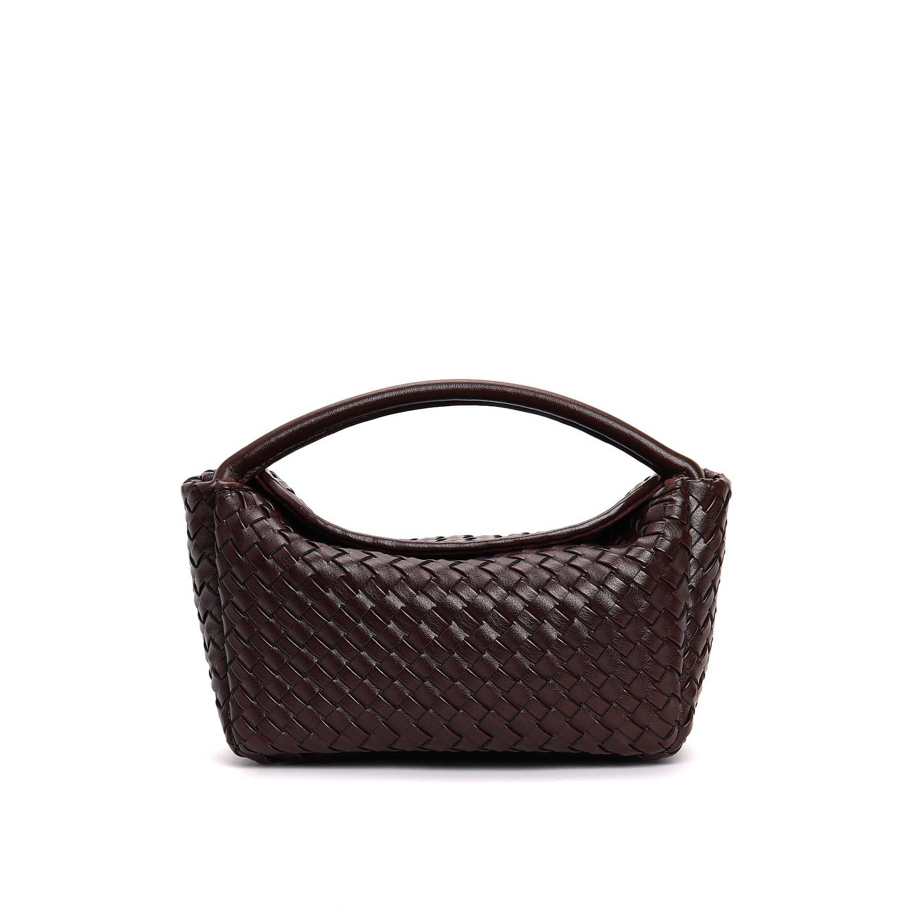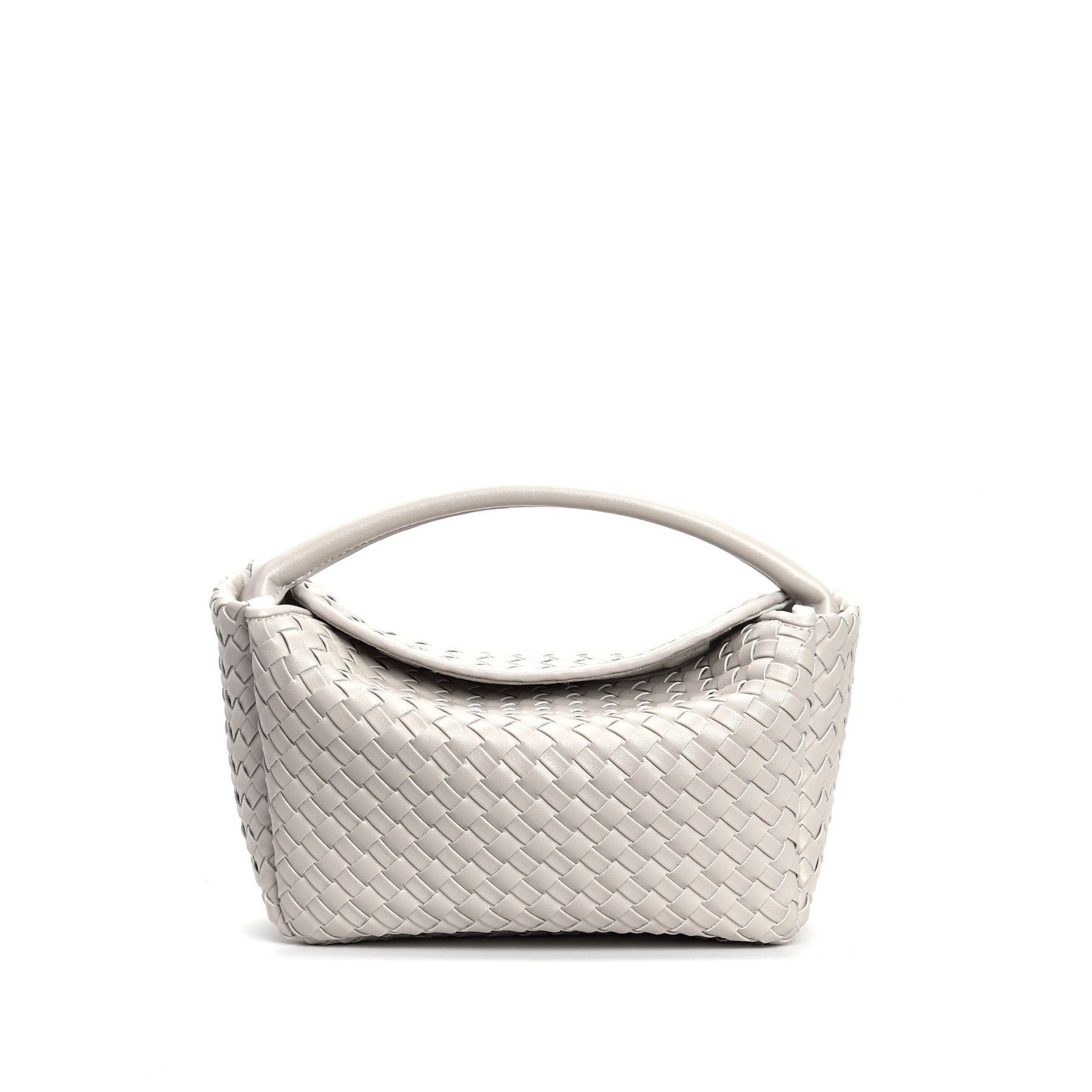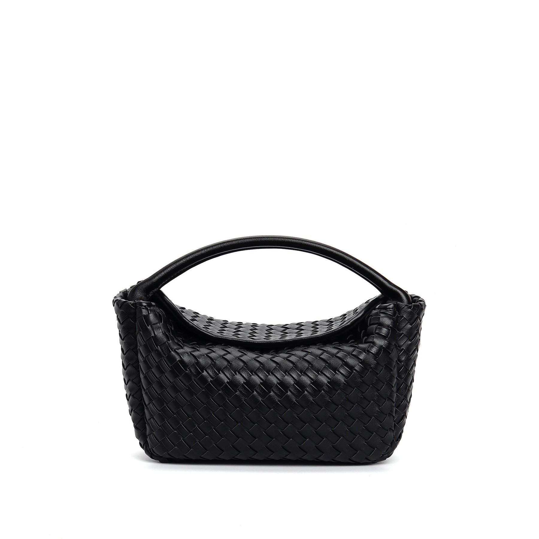 Sculptural sans effort, ce sac tissé noir et blanc présente une silhouette incurvée, des poignées supérieures structurées et un passepoil noir élégant. Un compagnon léger mais audacieux pour vos essentiels quotidiens.