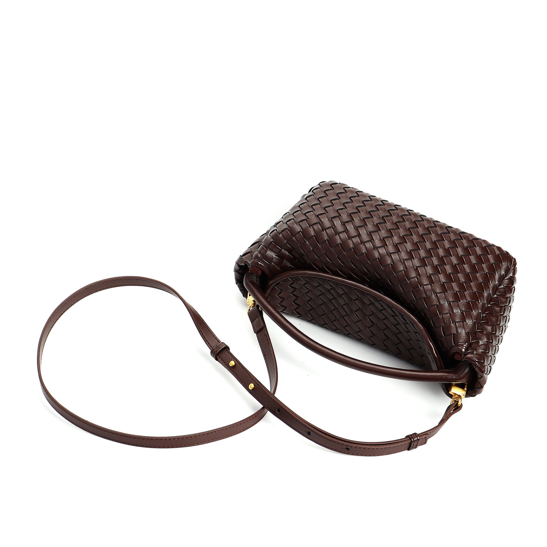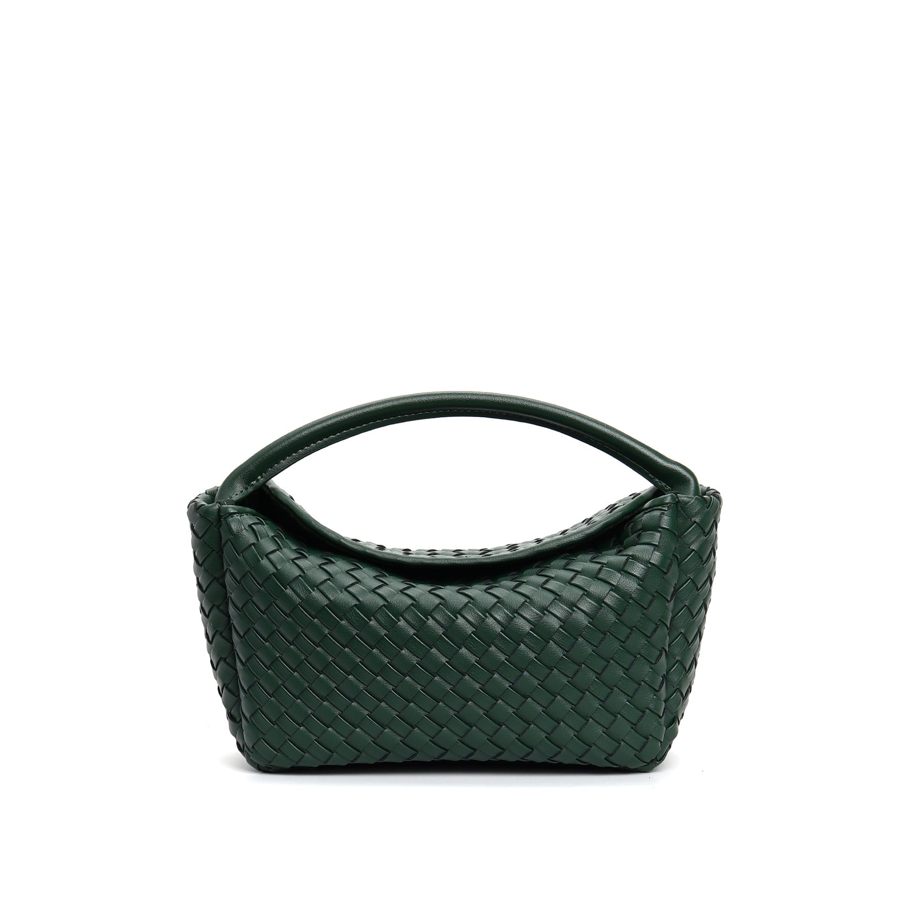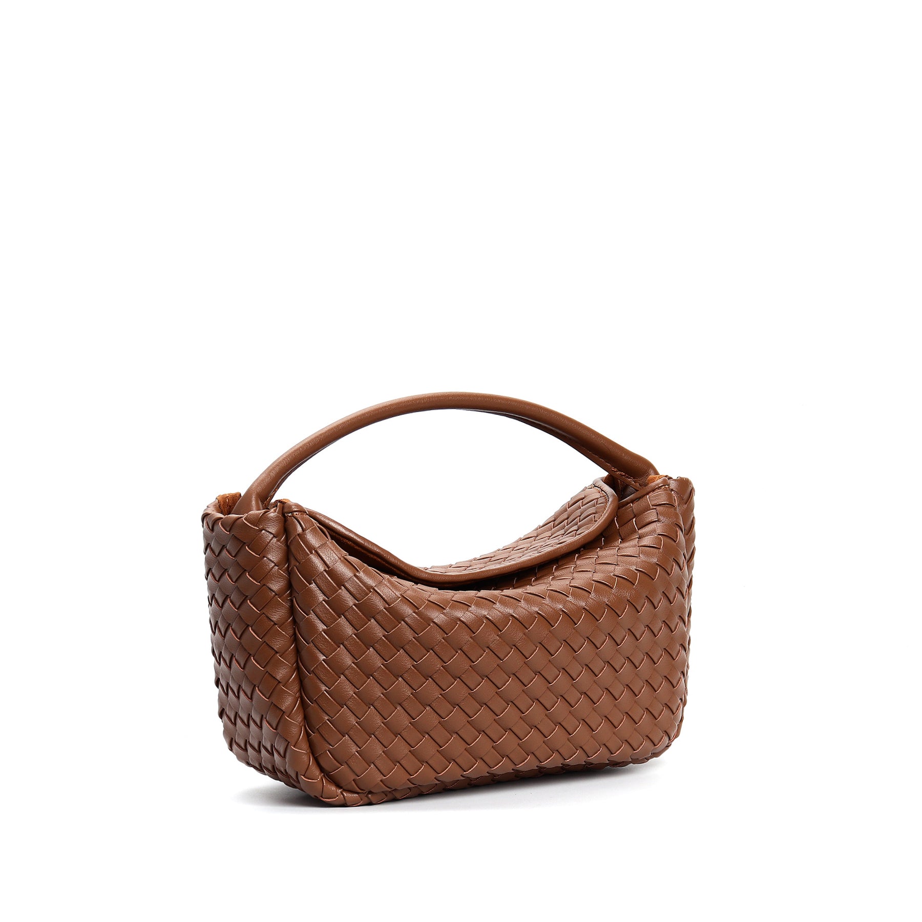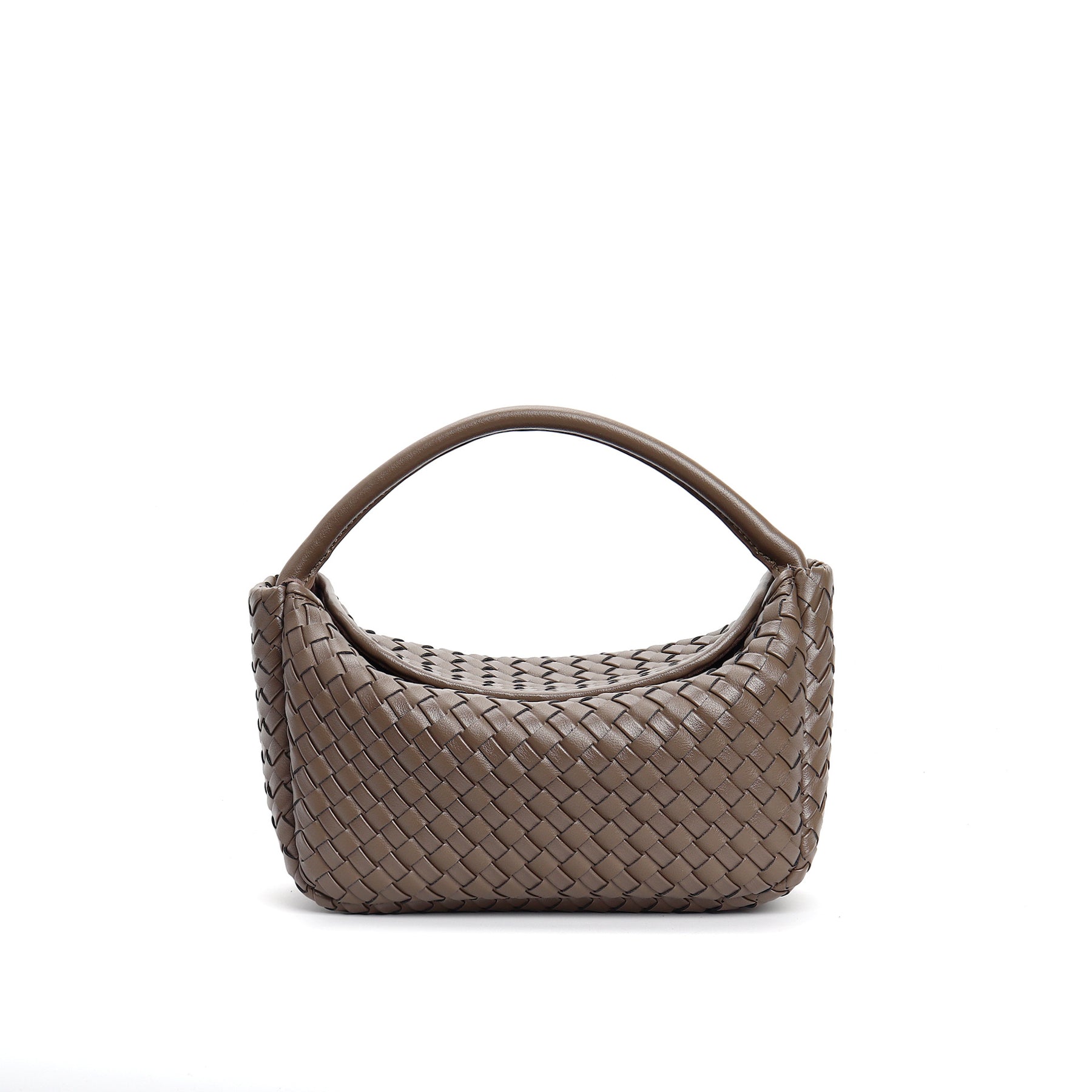 Sculptural sans effort, ce sac tissé noir et blanc présente une silhouette incurvée, des poignées supérieures structurées et un passepoil noir élégant. Un compagnon léger mais audacieux pour vos essentiels quotidiens.