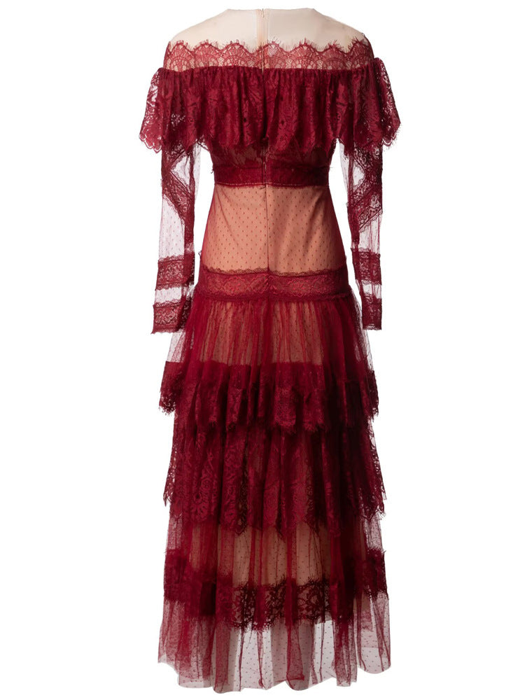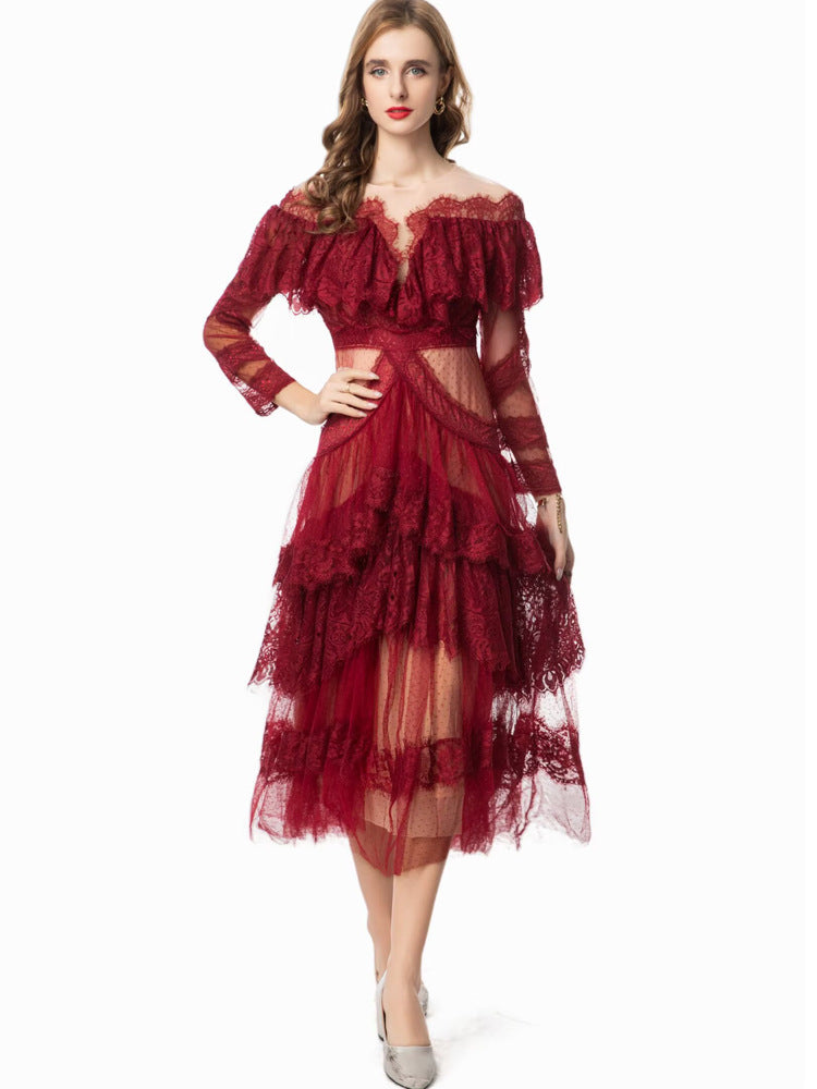 A captivating off-shoulder midi dress in deep scarlet red, crafted from sheer lace with romantic tiered ruffles. Its soft transparency and layered texture offer a dreamy, feminine silhouette—ideal for evening elegance or standout occasions.