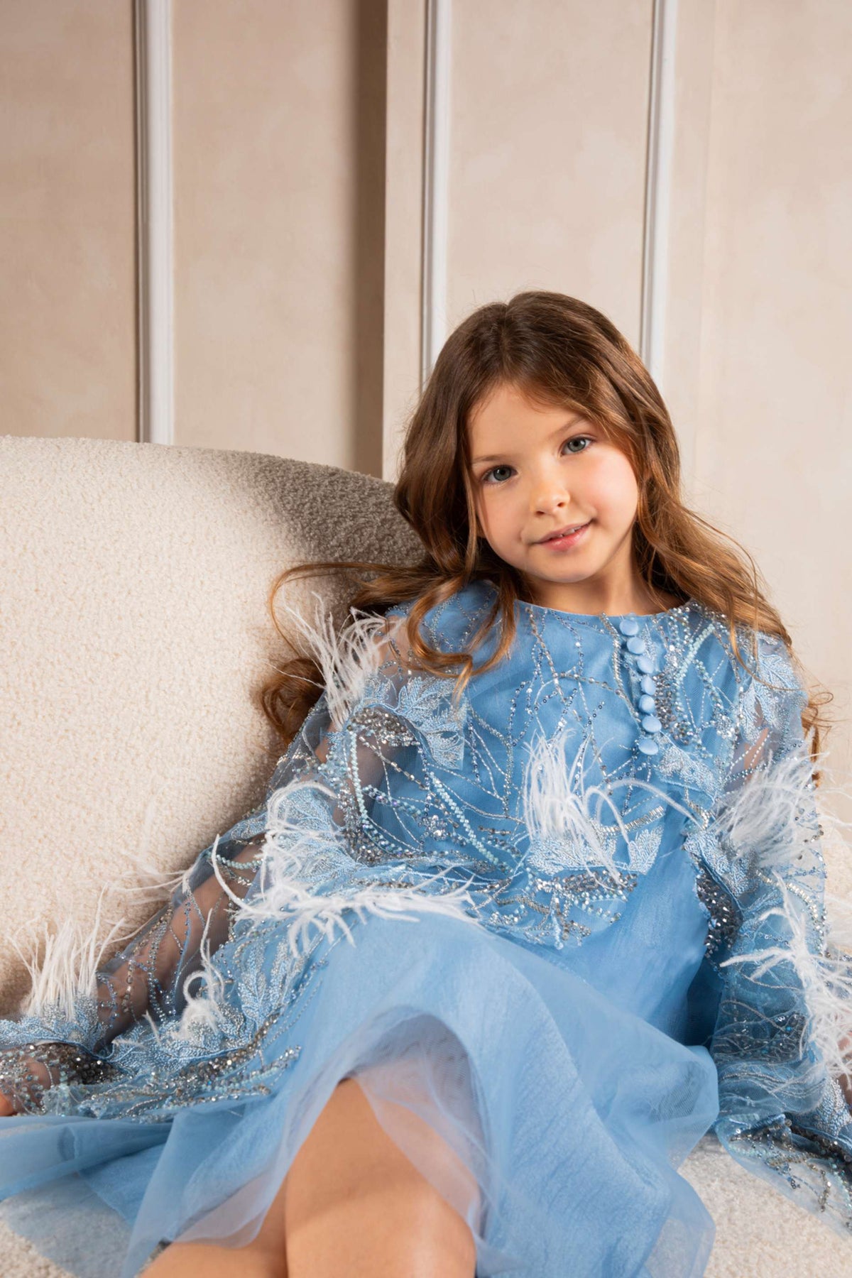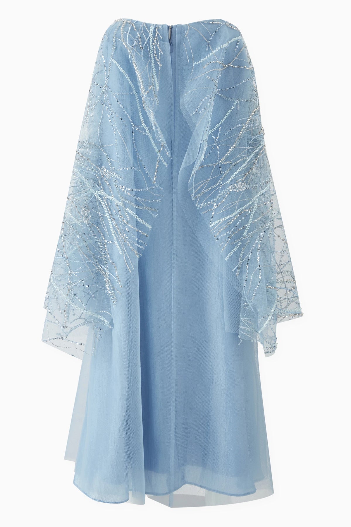 An elegant sky-blue chiffon mini dress featuring delicate embroidery and soft feather accents on wide sleeves. Designed with a flowy silhouette that offers both comfort and sophistication, this piece delivers a dreamy, feminine look—perfect for special occasions and refined celebrations.