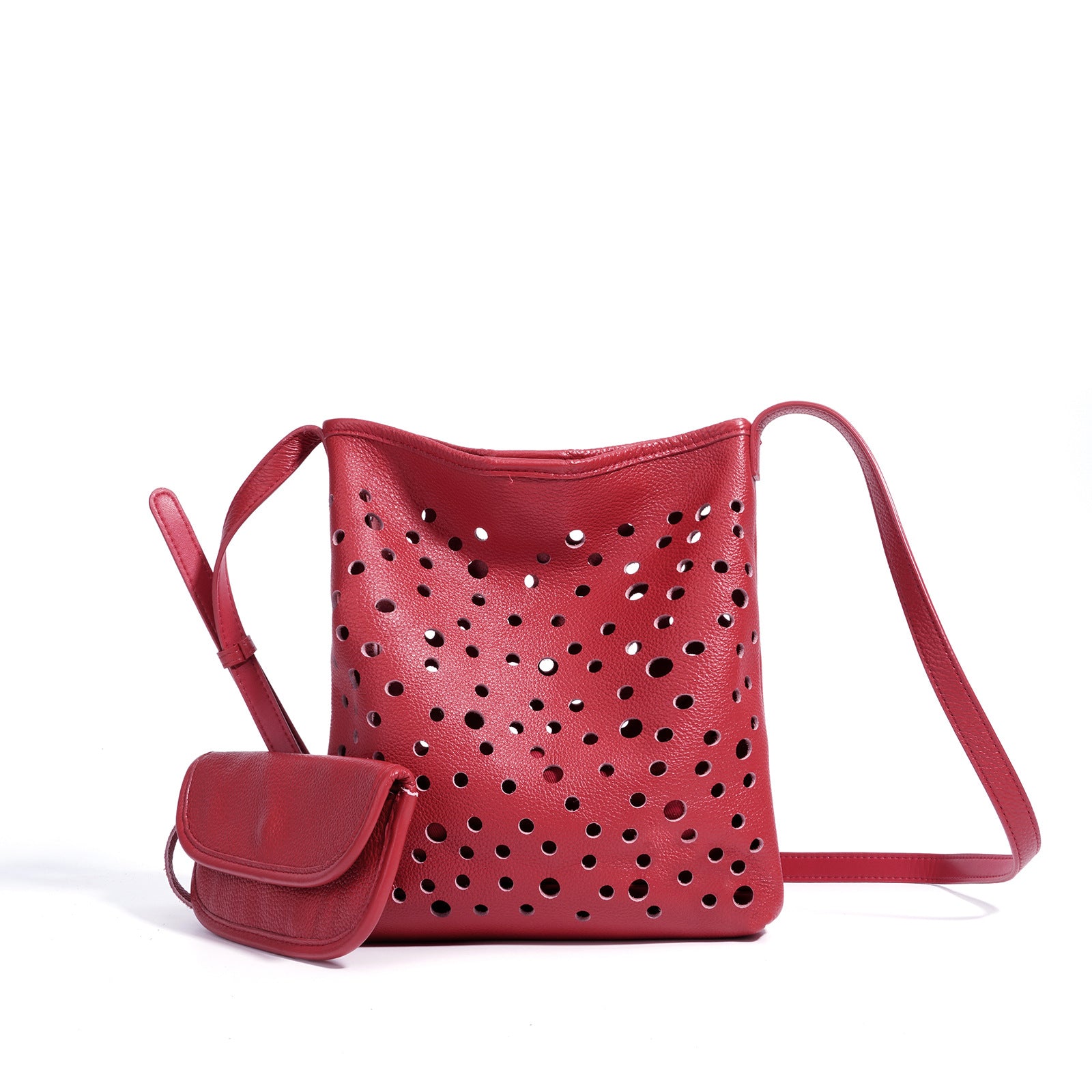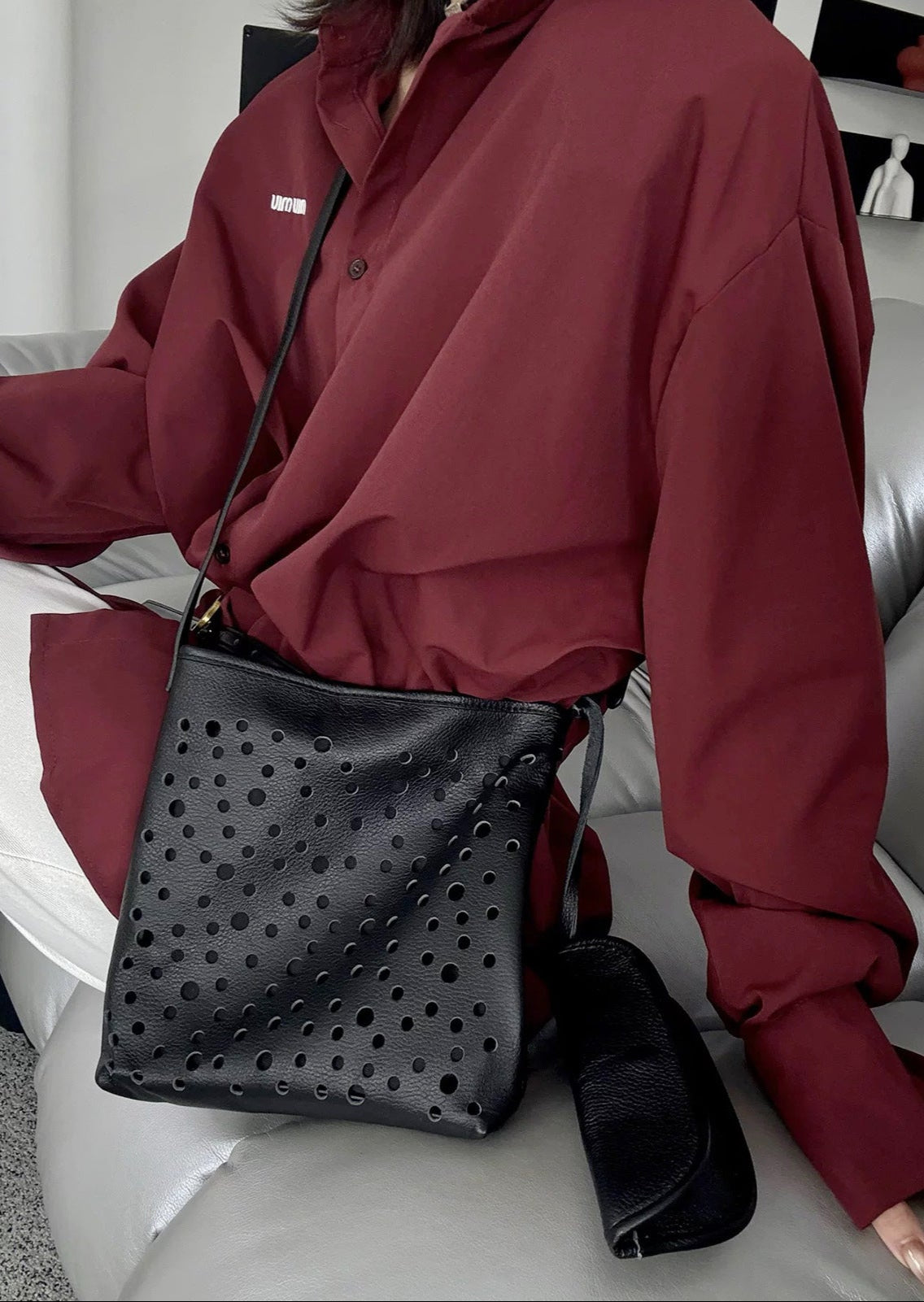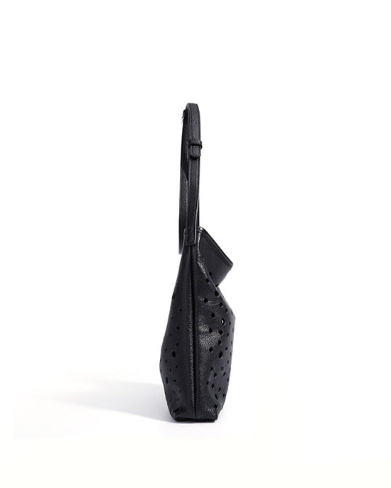 Un sac à bandoulière en croissant élégant et sculpté avec une sangle amovible et un design doux et incurvé. Confectionné en cuir lisse avec une fermeture éclair supérieure sécurisée, il ajoute une touche artistique.
