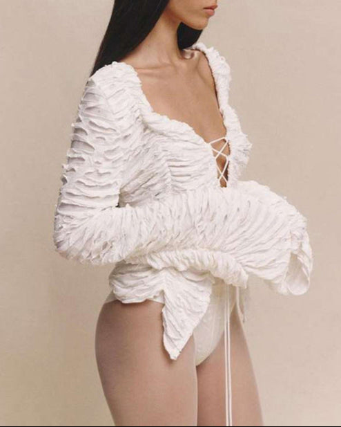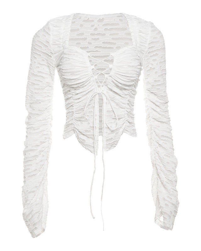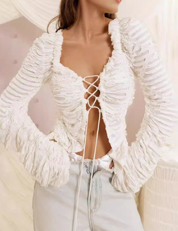 ruched lace-up mesh jacket with puff sleeves – SELENEP