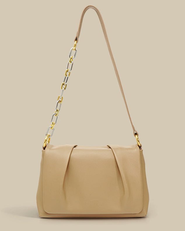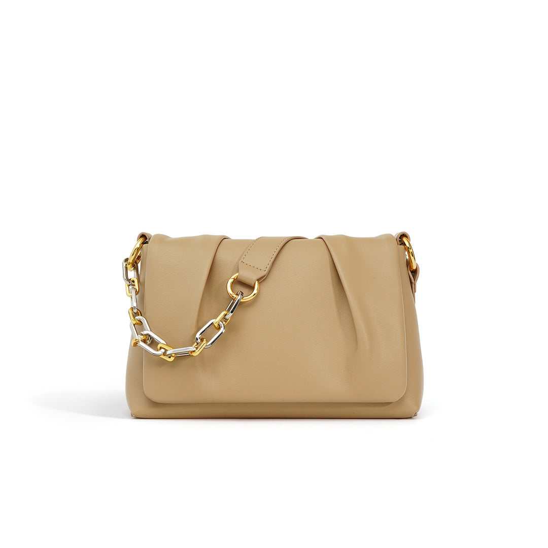 Un sac triangulaire au design unique fabriqué en cuir synthétique doux, avec un design sculpté et une poignée supérieure matelassée nouée aux deux extrémités. Son design compact et attrayant ajoute une touche artistique. Il est accentué avec des ferrures dorées et une fermeture magnétique pour plus d'élégance.